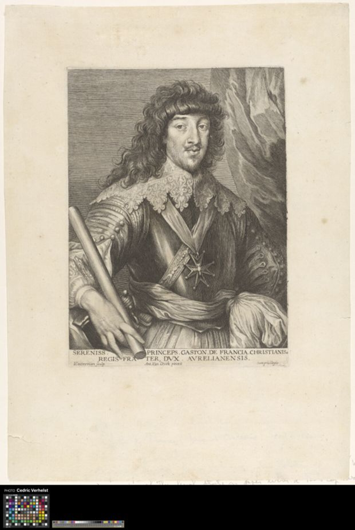 17de eeuwGaston van Orléans (1608-1660) was hertog van Orléans en prins van Franrijk. Hij was de zoon van Hendrik IV van Frankrijk en Maria d'Medici. Zijn oudere broer was koning Lodewijk XIII. Gaston is ten halve lijve naar rechts geportretteerd, met de blik naar links. Hij heeft lang donker haar, dat tot over zijn schouders valt, een kleine puntige snor en een sikje. Zijn kleding straalt vorstelijkheid uit, met de witte kraag en rijk versierde jas. Om zijn hals draagt hij een lint waaraan een achtpuntige ster hangt, met in het midden een duif. Dit is het kruis van de Orde van de Heilige Geest, de belangrijkste ridderorde van Frankrijk. Om zijn middel is een lap stof geknoopt en schuin over de borst hangt nog een riem. In het schilderij van Antoon van Dyck, waarop deze prent gebaseerd is, zien we dat Gaston een zwaard aan deze gouden riem heeft hangen. Ook zien we daar dat hij met zijn rechterarm op de helm van een harnas steunt, een helm die in deze prent niet goed zichtbaar is. Onder de voorstelling zijn de naam van Gaston, zijn functie en de namen van de makers gedrukt. De tekst wordt op speelse wijze onderbroken door de vingers van de rechterhand van de hertog en de commandostaf die hij in dezelfde hand heeft, en welke tot buiten het kader van de voorstelling komen.