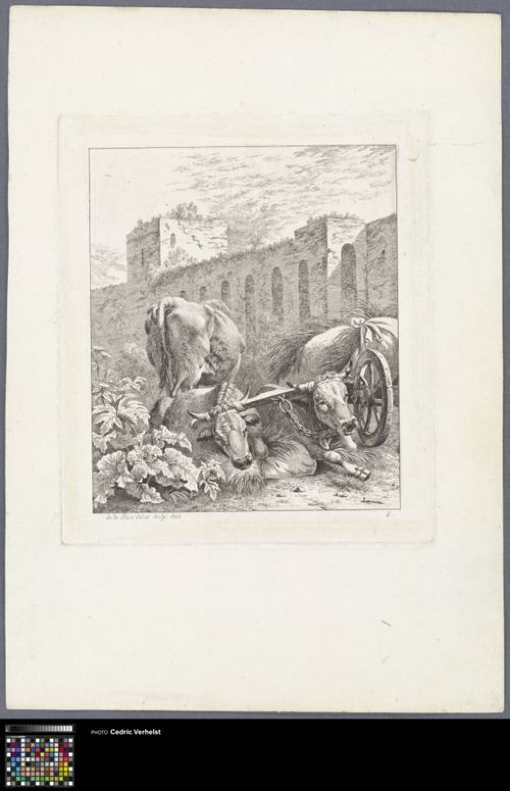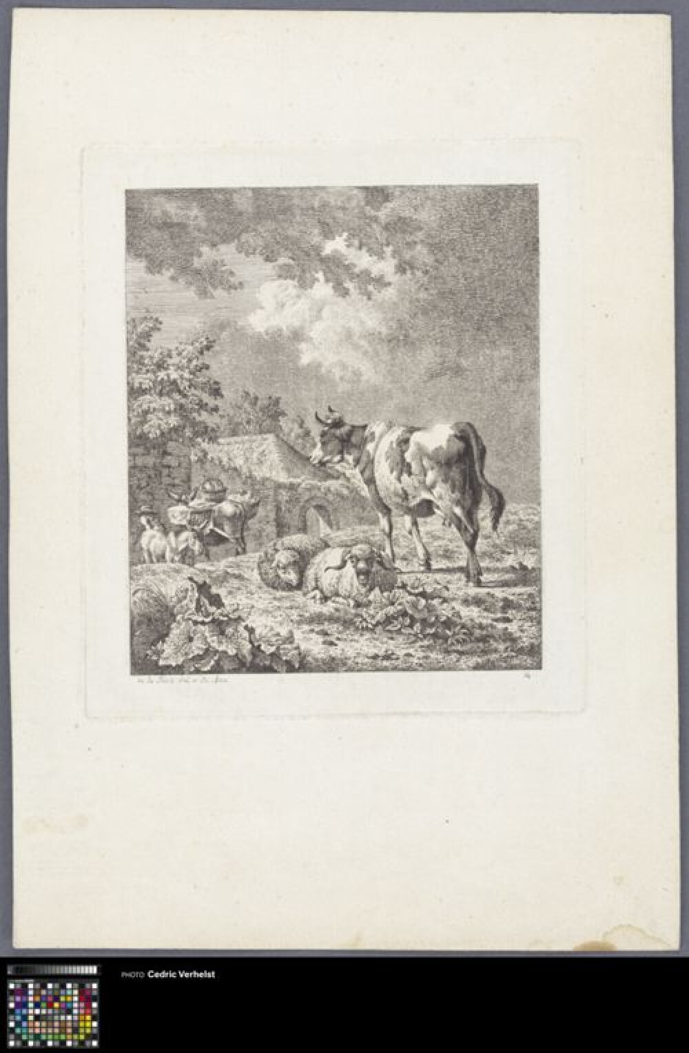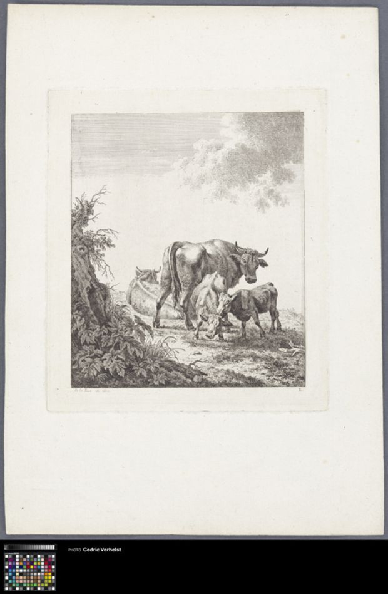 19de eeuwEts van vier koeien in een landschap. Maakt deel uit van een reeks van 8 prenten met landelijke taferelen van koeien of geiten gemaakt in 1800. Pierre-Louis De la Rive was één van de grondleggers van de Zwitserse landschapsschilderkunst.