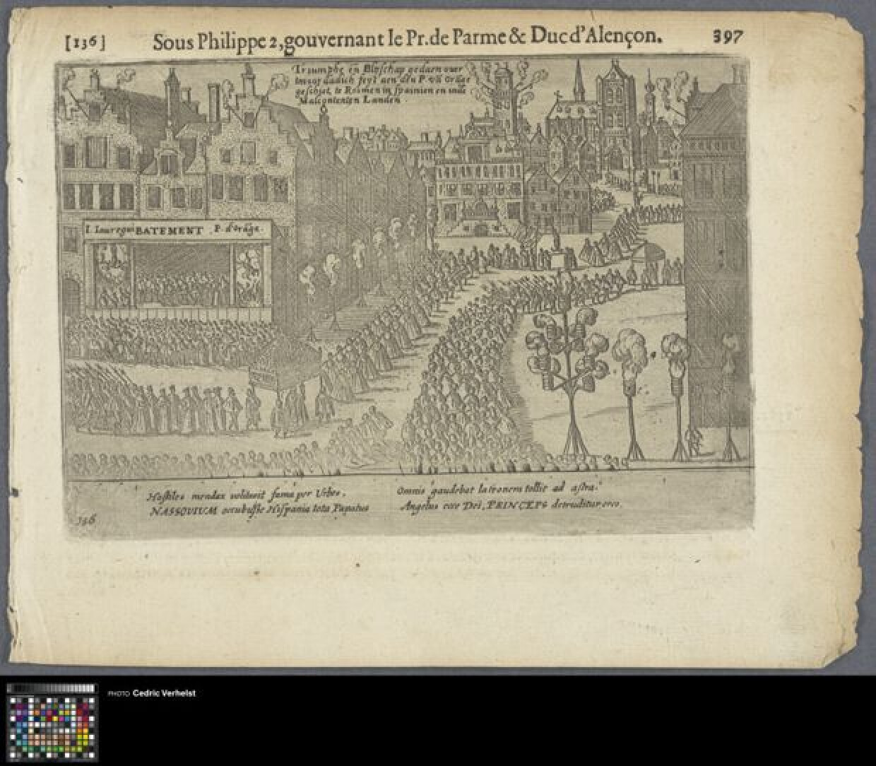 opschrift (in de voorstelling): [136] Sous Philippe 2, gouvernant le Pr. de Parme & Duc d'Alençon. 397/ Triumphe en Blijschap gedaen ouer/ tmoordadich feyt aen den P. va Orage/ geschiet, te Roomen in Spainien en inde/ Malcontenten Landen./ I. Iauregui (-) BATEMENT (-) P. d'orage./ 136/ Hostiles mendax volitavit fama per Urbes, NASSOUIUM occubuisse Hispania tota Papatus/ Omnis gaudebat latronem tolit ad astra/ Angelus ecce Dei, PRINCEPS detruditur orco.