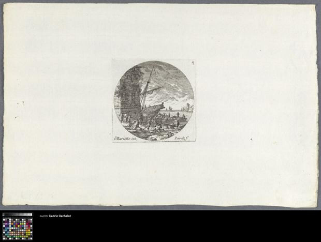 17de eeuwOp een oever met een verstevigde toren zijn vele figuren in de weer met het laden en/of lossen van een schip, dat naast de toren in het water ligt. Op de achtergrond zijn andere schepen te zien op het water. De naam Perelle kan verwijzen naar Gabriel Perelle of zijn zoons Adam en Nicolas Perelle.