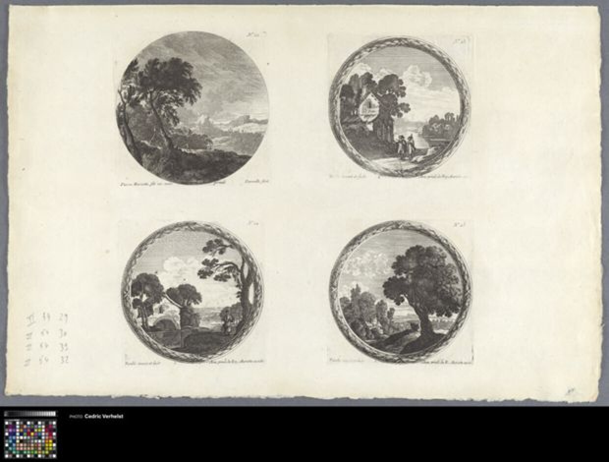 17de eeuwDe prent links boven toont twee donkere, smalle bomen en een drietal kleine figuren. Het landschap vervaagt op de achtergrond en zorgt zo voor diepte. De prent rechts boven toont twee wandelende figuren, langs een huis links en met andere huizen en bomen op de achtergrond. Links onder het blad is een prent gedrukt met een brug, die gespiegeld wordt in het water en geflankeerd wordt door bomen. Rechts wandelt een figuur langs een boom. De vierde prent toont een donkere boom met volle kruin, en verderop nog bomen en een huis.