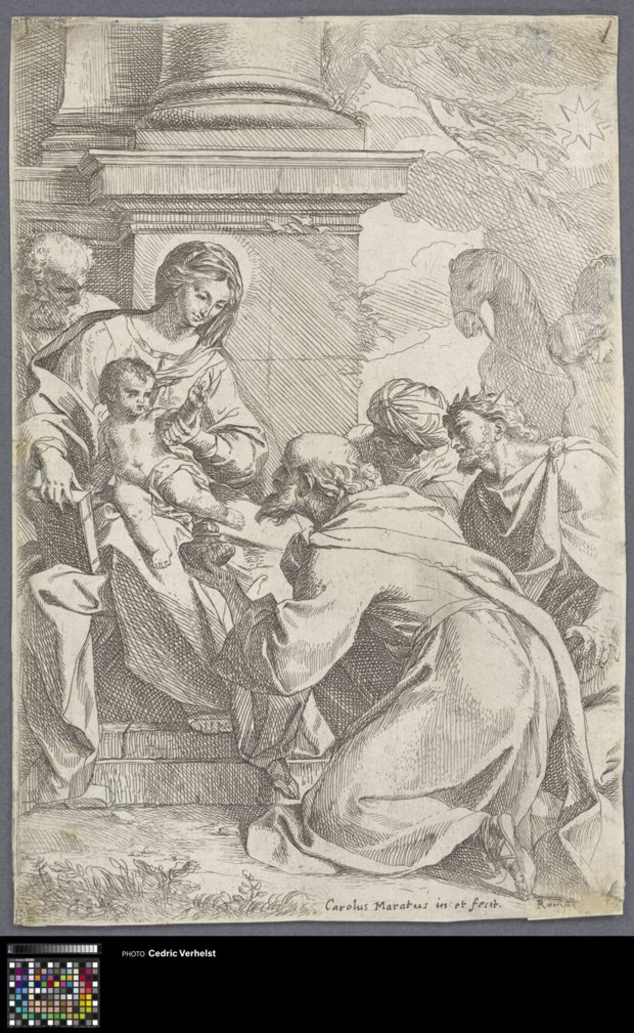 18de eeuw 17de eeuwDeze ets toont het Bijbelse tafereel van de aanbidding der koningen. Links is de heilige familie afgebeeld, met Jozef op de achtergrond en Maria met het Jezuskind op schoot vooraan. Maria heeft een aureool boven haar hoofd en heft het handje van het kind op. Met haar andere hand houdt zij een boek vast, dat rechtop op haar schoot staat. Zij zitten aan de voet van een tempel. Aan de rechterkant in de voorstelling zijn de drie koningen afgebeeld. Zij knielen voor het kind en bieden hem geschenken aan. In de lucht is de ster te zien die de koningen hebben gevolgd om het kind te vinden.