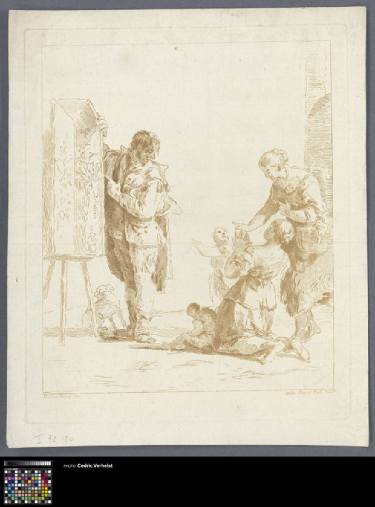 18de eeuwEen man in een haveloze mantel toont en wijst op een religieus beeld aan een vrouw die knielt in gebed terwijl een andere vrouw met een mand achter haar staat. Eén kind kijkt naar de rechtstaande vrouw en wijst naar het beeld, een ander kind zit met hoofd omloog tegen de knielende vrouw. Aan de voeten van de man zit een hond, langs achteren afgebeeld. De man lijkt terug te keren in andere gelijkaardige prenten door dezelfde uitgever en naar dezelfde tekenaar. Mogelijks behorende tot een reeks.