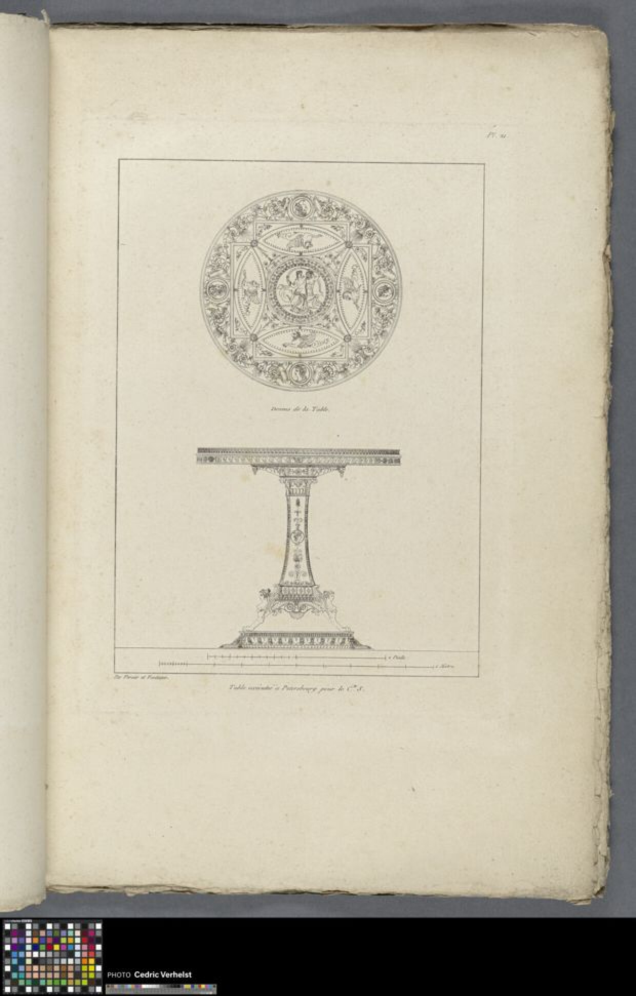 19de eeuwPlaat 21 uit de publicatie 'Recueil de décorations intérieures comprenant tout ce qui a rapport à l'ameublement' door Percier en Fontaine. De publicatie dateert ten vroegste uit 1801. De voorstelling toont een tafel in empire-stijl. Bovenaan is het tafelblad te zien langs boven. Antieke figuren, chimera's, pegasi en florale motieven versieren het symmetrisch ingedeelde oppervlak. Ook de voet en zijkant van de tafel is versierd met onder andere meanders, sphinxen en groteske motieven.