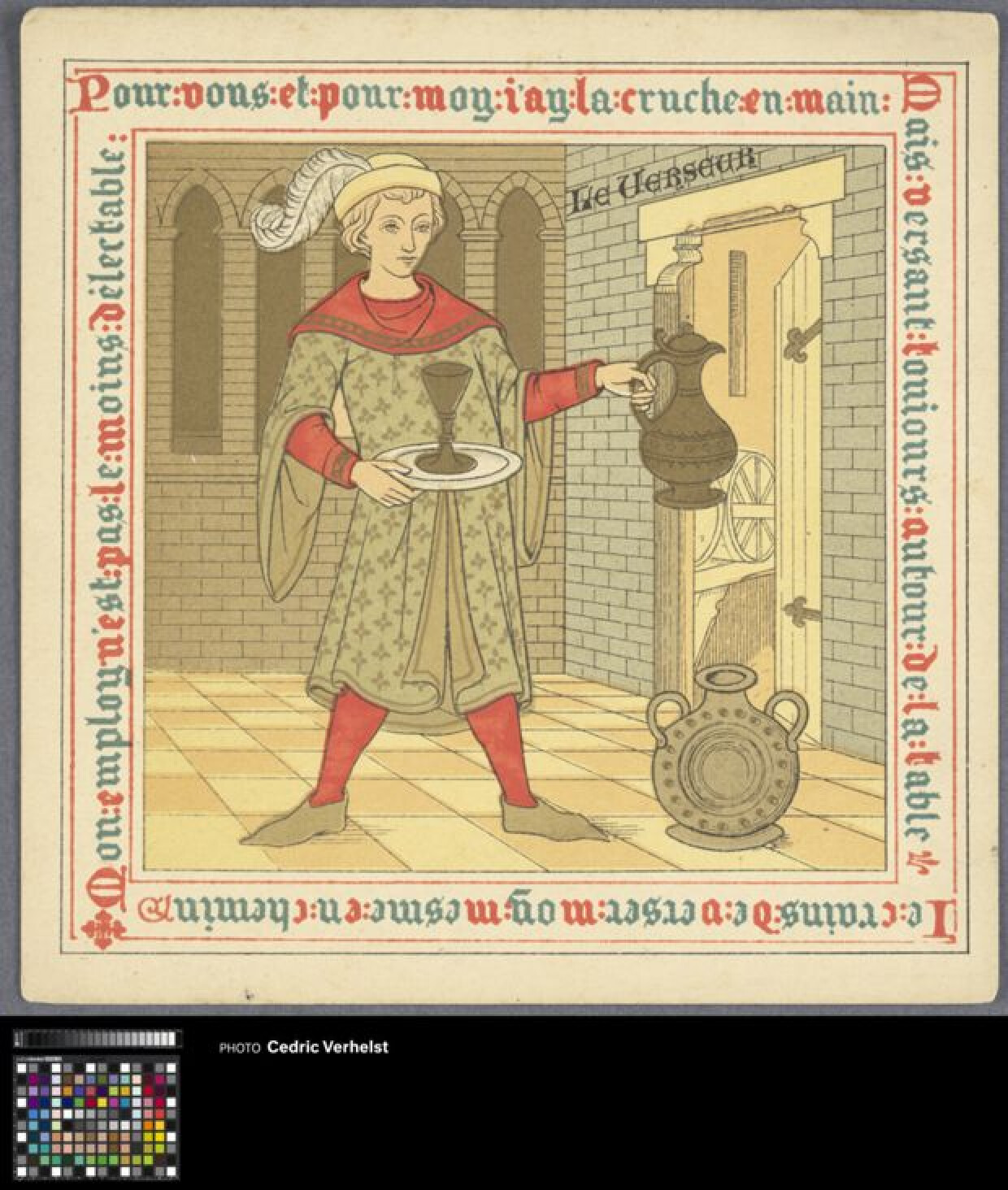 19de eeuwPrent uit een reeks cartes de rois of billets de rois. De voorstelling bevindt zich in een kader met verzen. De prent toont een uitschenker of schenker. Hij draagt een beker op een schotel en heeft met zijn linkerhand een kan vast. Hij draagt een lang gewaad, kousen, een hoed met een veer en puntschoenen naar middeleeuwse traditie. Op de grond staat ook een grote kan met twee oren. Op de achtergrond staan enkele splitsbogen en een deuropening naar een kamer met vaten.