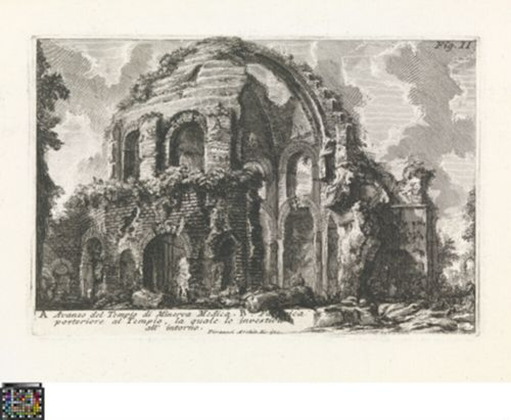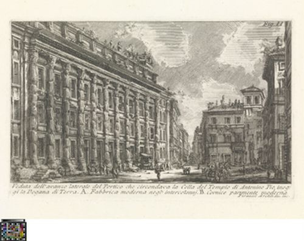 opschrift (in de voorstelling, onderaan): Colonna Antonina. A Curia Innocenziana / edifitcata sulle rovine dell'Anfiteatro di / statilio Tauro. / Piranesi Archit. dis. inc.