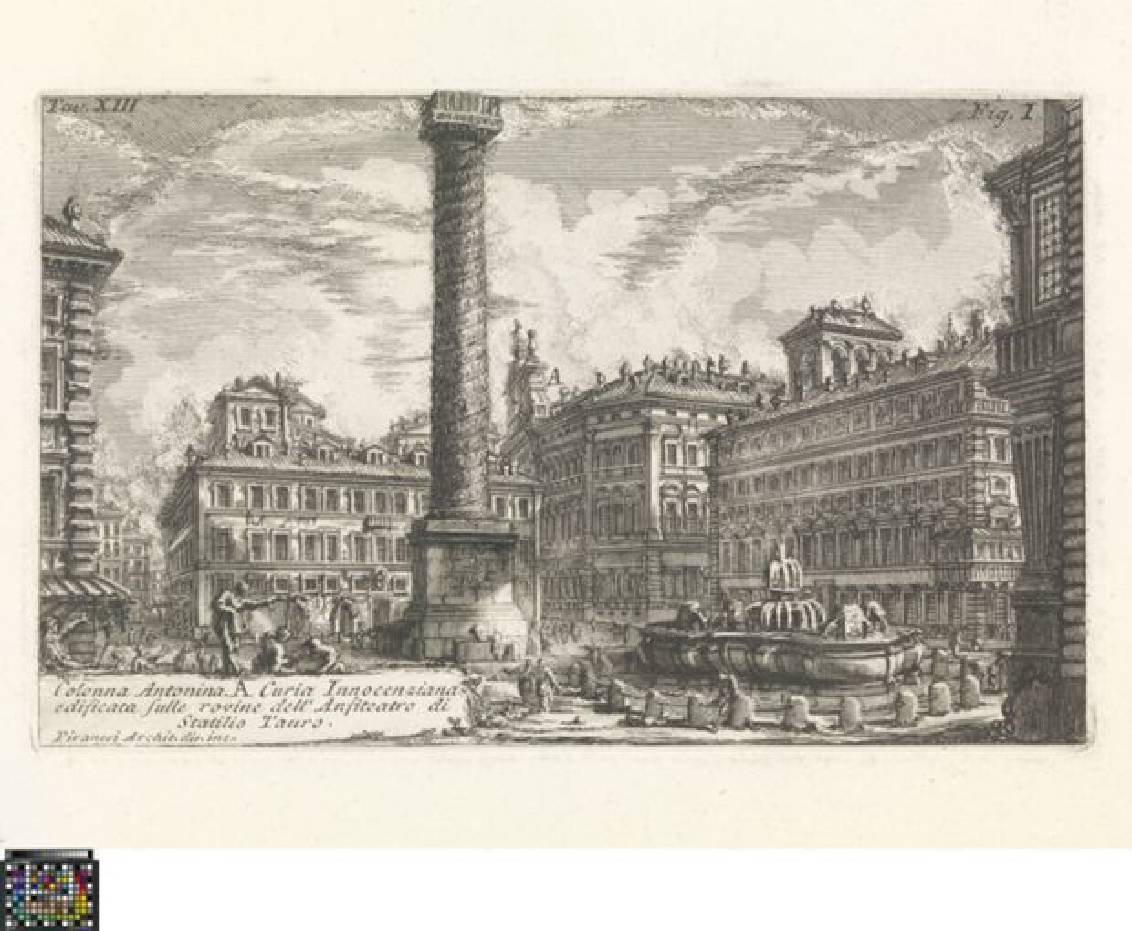 In het midden van de voorstelling is de zuil van Marcus Aurelius afgebeeld, die op het moment dat deze prent werd gemaakt nog werd geïdentificeerd als de zuil van Antoninus. De zuil is omringd door modernere gebouwen en rechts op de voorgrond staat een fontein. De prent is gemaakt door Giovanni Battista Piranesi en behoort tot zijn reeks La Antichità Romane met gezichten op Romeinse oudheden. Deze prent is de eerste afbeelding van het eerste deel (John Wilton-Ely, Giovanni Battista Piranesi. The Complete Etchings, nr. 302).