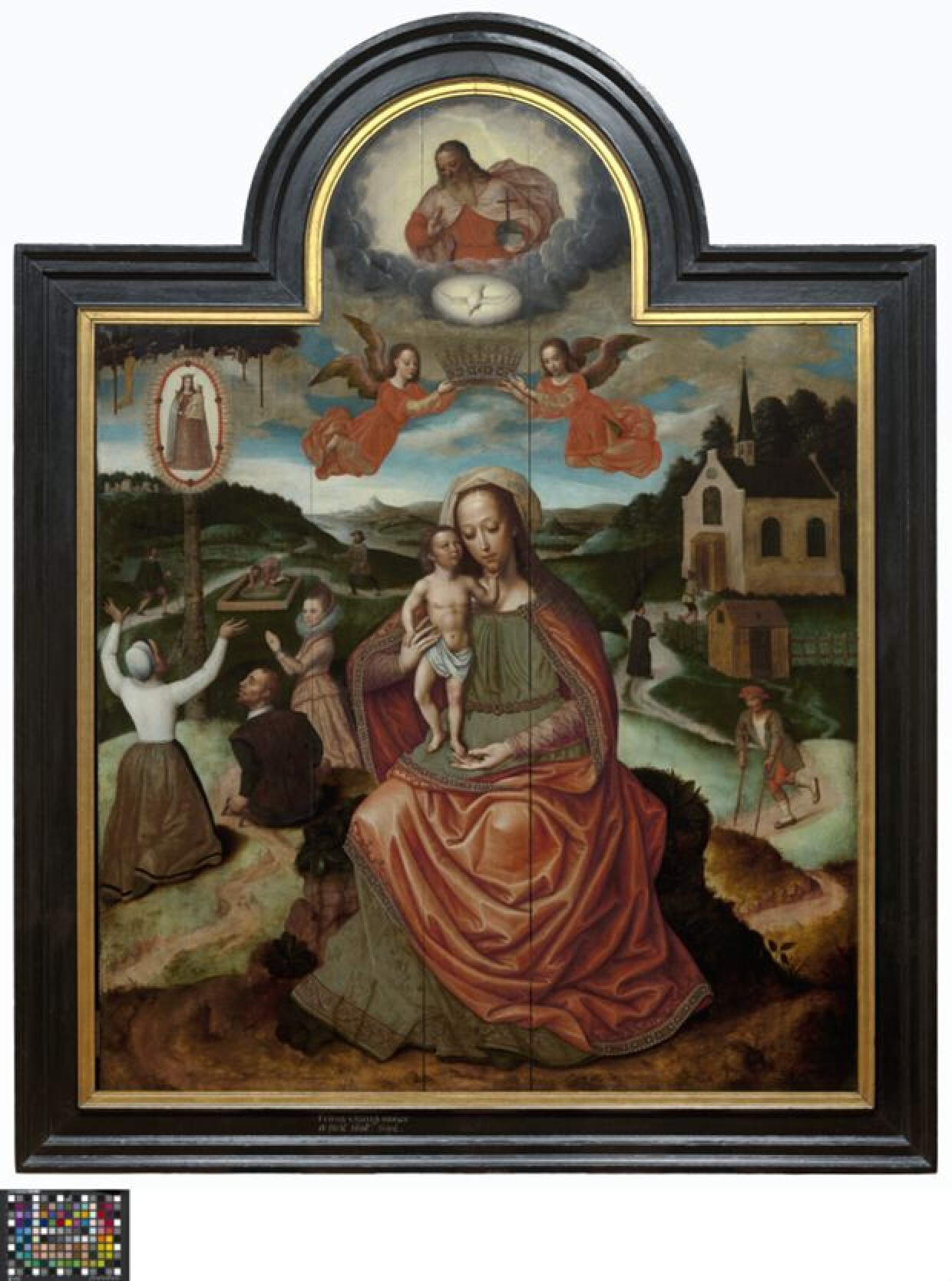 17de eeuwOnze-Lieve-Vrouw zit centraal, het Kind staat recht op haar schoot. Boven haar hoofd zweven twee engelen die haar zullen kronen tot Koningin van de hemel. Daarboven in een wolk zweeft God de Vader met onder hem de Heilige Geest in de gedaante van een duif. Links knielen enkele personages onder wie een kreupele man, voor Onze-Lieve-Vrouw. Aan de takken van de boom hangen allerlei gebruiksvoorwerpen zoals krukken en houten benen, als blijk van dankbaarheid voor verhoorde gebeden om genezing. Op de achtergrond de kapel van Scherpenheuvel. Olieverf op paneel.