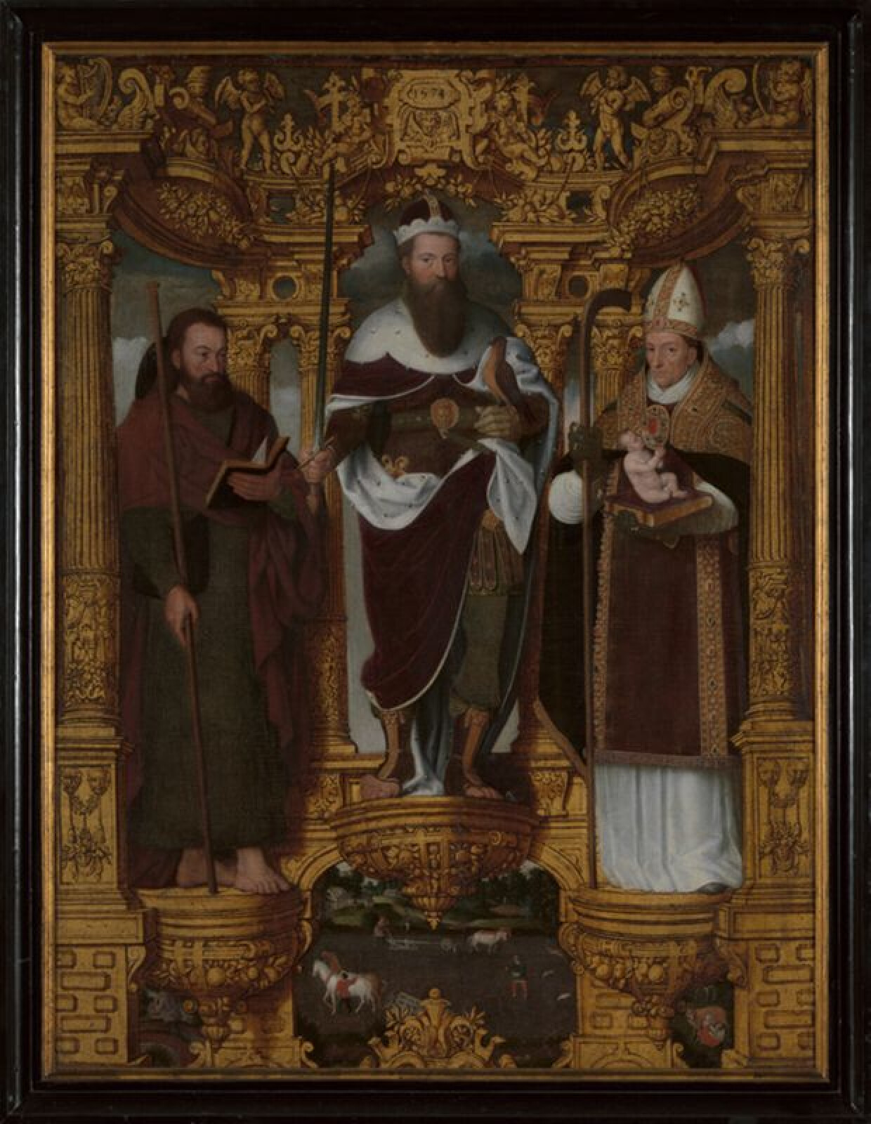 16de eeuwIn een met zwart op goud getekende renaissance-architectuur staan drie heiligen elk op een halfronde sokkel: links de heilige Jacobus als pelgrim met staf en boek, in het midden de heilige Bavo in prinselijke kledij met zwaard en valk en rechts de heilige Willibrordus van Echternach als bisschop met een boek waarop een naakt kindje zit. De voorstelling van dit laatste attribuut, traditioneel aanwezig in Echternach, is echter uniek in de Nederlanden. De gouden constructie die op een triomfboog lijkt, is uitgewerkt als een open architecturale retabelbekroning. Onderaan biedt een drievoudige opening een doorkijk op het platteland. In het middenveld wordt er geploegd, geëgd en gezaaid. Op de achtergrond hoedt een herder zijn kudde schapen. Links loopt een man, beladen met hazen of konijnen en een mand met gevogelte, over een boogbrugje, rechts melkt een vrouw een koe. De landelijke activiteiten zijn mogelijk een verwijzing naar de opdrachtgever van dit schilderij.