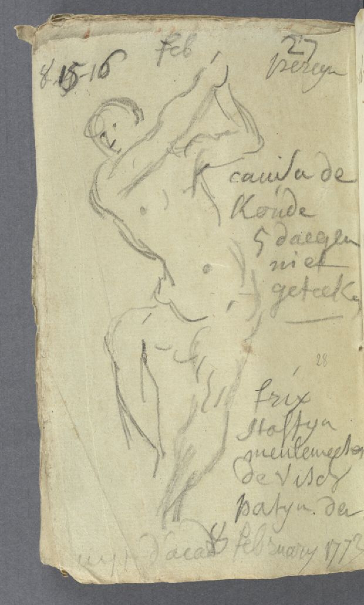 18de eeuw28ste bladzijde [blad 14, verso] uit een notitieboekje van Jan Garemijn, directeur van de Brugse Academie, daterend uit het schooljaar 1772-1773. Lijnschets in grijs potlood van een frontaal mannelijk naakt. Zijn bovenlichaam is licht naar links gebogen en de armen zijn schuin rechtsboven het hoofd weergegeven alsof de man een zwaaiende, neerwaartse "golf"-beweging maakt. Het rechterbeen is gebogen, de voet steunt wellicht op een (hier onzichtbare) sokkel. De man kijkt naar linksonder. Rondom de schets maakte Garemijn aantekeningen. Bovenaan wordt het model vermeld: Percyn poseerde de 27ste actie op 8, 15 en 16 februari 1773. Wegens koude weersomstandigheden werd er vijf dagen niet getekend. Onderaan noteerde Garemijn vier namen van leerlingen en Fricx (liefhebber), met de aantekening: 'uyt d'acad[emie]'. De betekenis is niet helemaal duidelijk, maar vermoedelijk werden deze leerlingen geschorst omdat ze opnieuw naar de "Comedie" gingen, zoals op de voorgaande bladzijde.