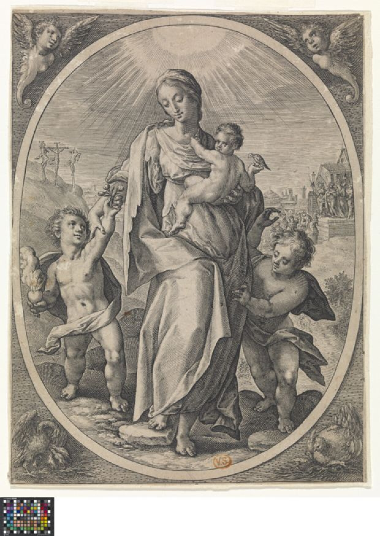16de eeuw 17de eeuwDe gravure (Hollstein XV, p. 181, nr 435) behoort tot een reeks van drie prenten, ontworpen, gegraveerd en uitgegeven door Crispijn de Passe I. In de voorgrond staat de Maagd Maria als Caritas met het Christuskind in haar armen met links en rechts van haar twee kinderen. Het jongetje aan haar rechterzijde houdt een hart in zijn hand en biedt haar enkele bloemetjes aan. In de achtergrond twee scènes met de 'Kruisiging' en 'Pilatus toont Christus aan het volk'. De prent is afgesneden op de voorstellingsranden.