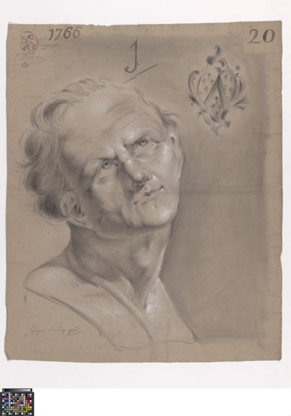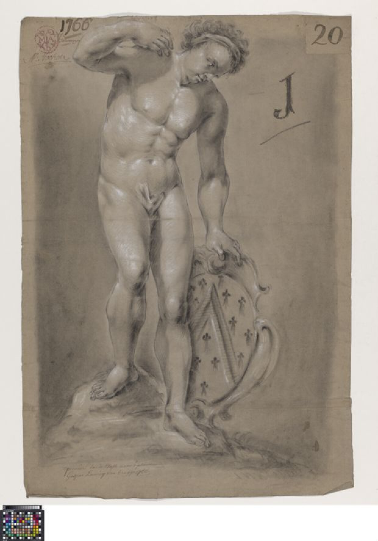 18de eeuwAcademische studie naar sculptuur van een naakte man met een wapenschild, getekend door Gaspar Hanicq in 1766. Hij maakte deze studie tijdens de prijskamp aan de Academie Brugge. Hij won de eerste prijs en werd 'primus' in de klas naar sculptuur of 'plaester' zoals het opschrift onderaan aangeeft. Hanicq tekende de sculptuur voluit en frontaal gezien. De naakte jongeman draagt een haarband en staat op een verhoogde ondergrond. Hij buigt voorover en houdt zijn rechterhand op zijn schouder. Zijn andere hand leunt op een wapenschild in geprofileerde lijst met keper in een veld van hermelijn. Het gaat om het wapenschild van de familie D'Hooghe-Pattyn. Uit de notitieboekjes van directeur Jan Garemijn weten we dat deze familie schenkingen deed aan de Academie. Wellicht wordt er aan hen een eerbetoon gegeven. De studie is getekend met zwart krijt of houtskool en hoogsels in wit krijt. Er is een aangelijmde strook onderin met verderzetting van de compositie en de wedstrijdannotatie, wellicht geschreven door Garemijn. Linksboven plaatste Garemijn zijn handtekening, naast de academiestempel. Onder de stempel is een tweede handtekening geplaatst, wellicht van Charles Stockhove. Het etiket met het tekennummer van Hanicq werd bovenaan rechts op het tekenpapier bevestigd. Hanicq maakte een tweede studie tijdens de wedstrijd: 0016.GRO0024.II.