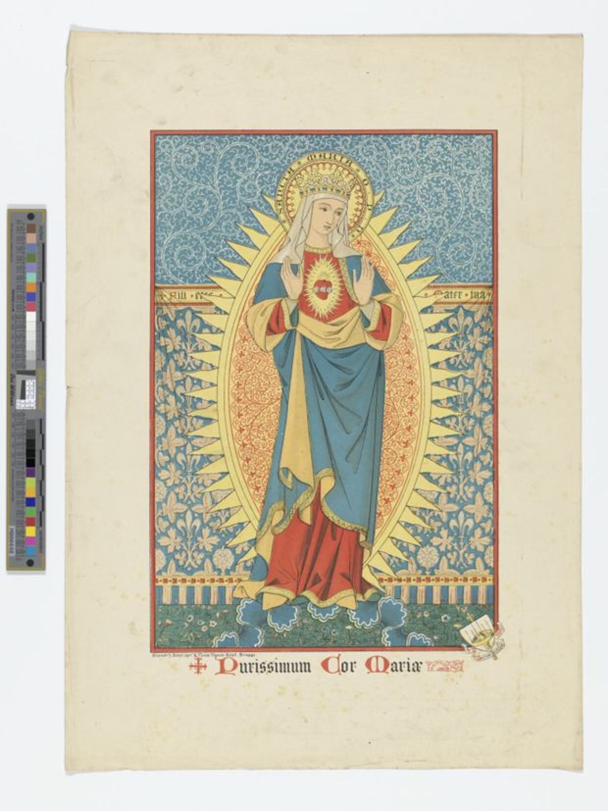 19de eeuwDevotieprent in neogotische stijl van Maria. De prent werd uitgegeven door uitgeverij Van de Vyvere-Petyt en de ‘Heilige Beeldekensgilde’. Met de oprichting in 1864 van de Heilige Beeldekensgilde (door o.m. kan. Adolf Duclos, Guido Gezelle en Joseph Neurath) drong de neogotiek definitief door in het Brugse drukwerk. De koploper in deze evolutie was de lithograaf Jakob Petyt (1822-1871). Sinds 1844 had hij zijn atelier in Brugge opgestart waar hij vanaf 1864 neogotisch drukwerk leverde. Na zijn dood, in 1871, nam zijn weduwe het bedrijf over. Vanaf 1875 kwam het bedrijf in handen van haar schoonzoon Karel Van de Vyvere-Petyt (1852 - 1922) tot 1914. Neogotische (bid)prentjes, diploma's en ander religieus drukwerk in kleurenlithografie vormden het handelsmerk van deze drukkerij.
