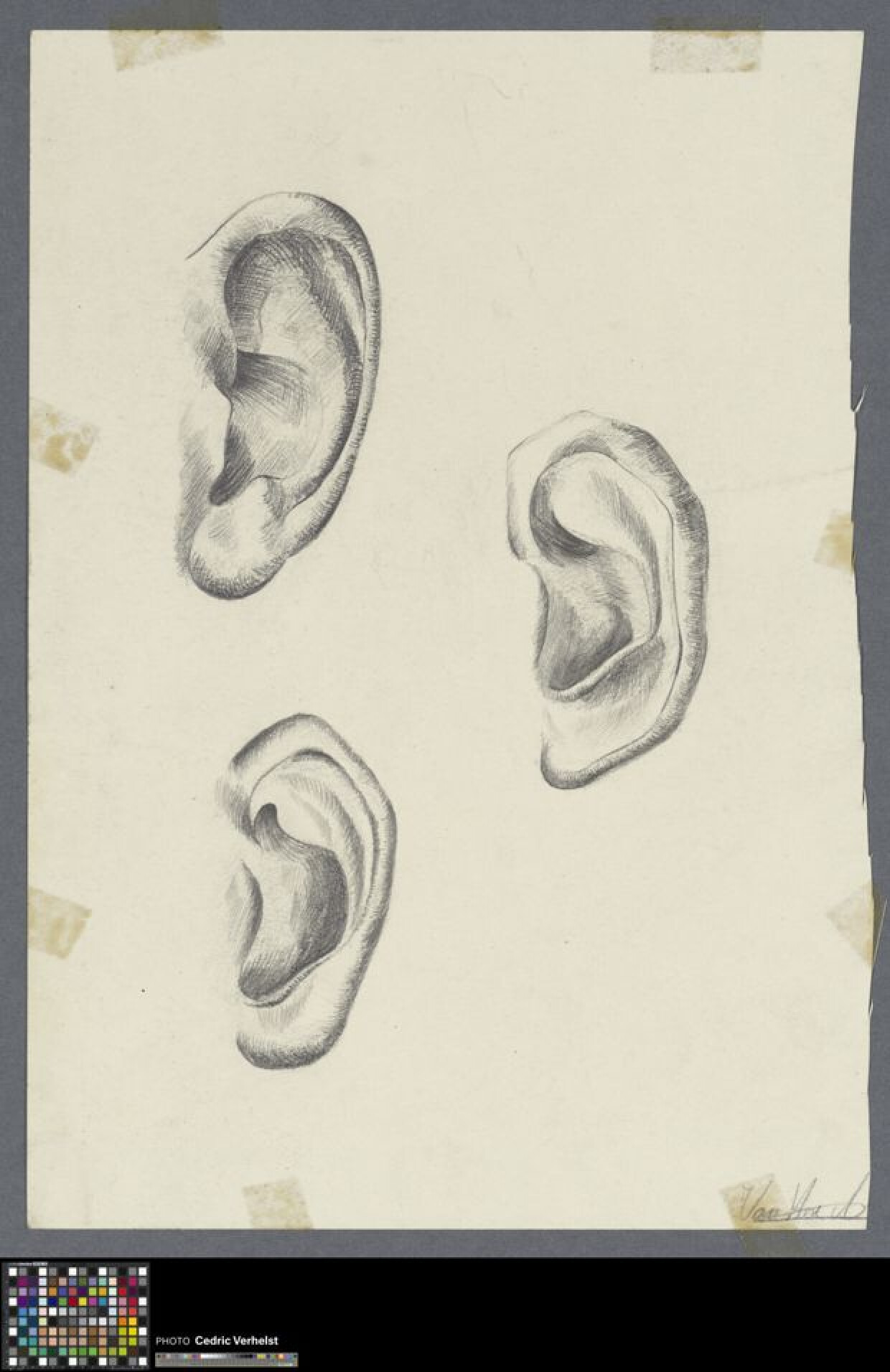 19de eeuw 20ste eeuwAcademische studie van drie oren, getekend in potlood. De oren zijn geschetst met uitwerking van schaduw en diepte. De naam van de tekenaar is vermoedelijk vermeld onderaan rechts, de datum is onbekend. De tekening is afkomstig van de collectie Academie Brugge. Wellicht werd ze dus door een van haar leerlingen getekend.
