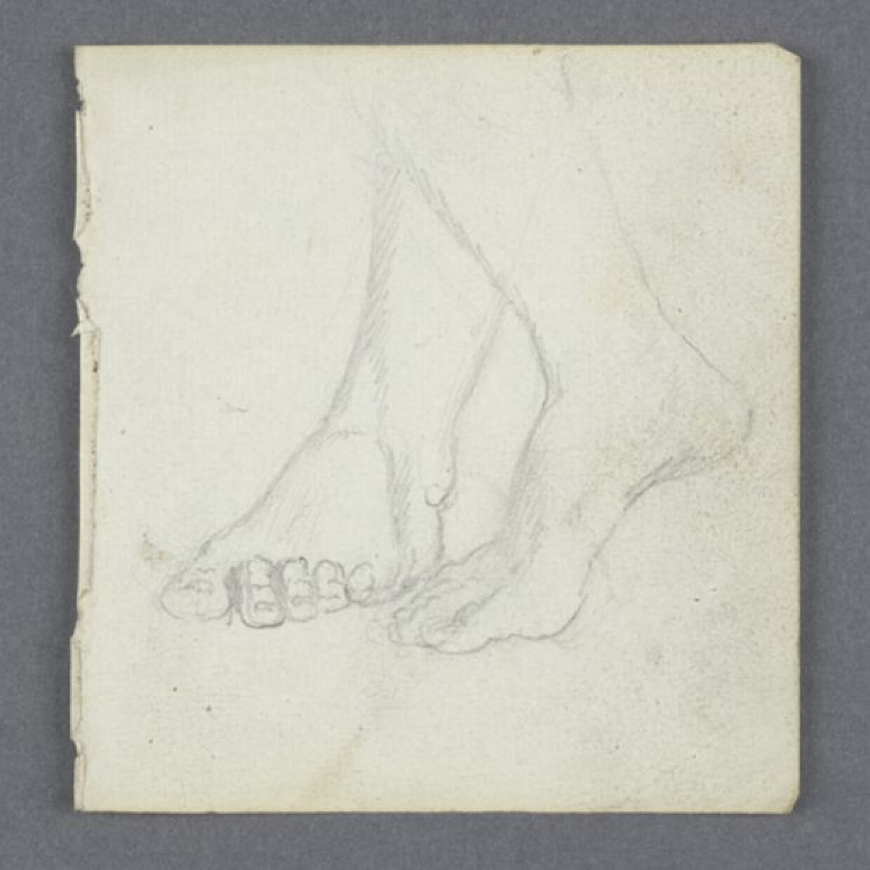 Studie in grijs potlood op klein papierformaat, getekend door Jan Garemijn. Het los blad was oorspronkelijk ingebonden met de andere 23 schetsblaadjes uit deze reeks. De schetsen werden eerder bewaard bij Garemijns notitieboekje 0000.GRO1676.7.II uit 1773-1774 toen hij directeur van de Brugse Academie was. Op dit blad is een paar voeten geschetst. De linkervoet is frontaal afgebeeld en steunt op de grond. De rechtervoet steunt enkel op de voorvoet en is in profiel getekend. De figuur staat met gekruiste benen. Het gaat misschien om een detail van de figuur op 0023.GRO0400.23.II. Verso: blanco.