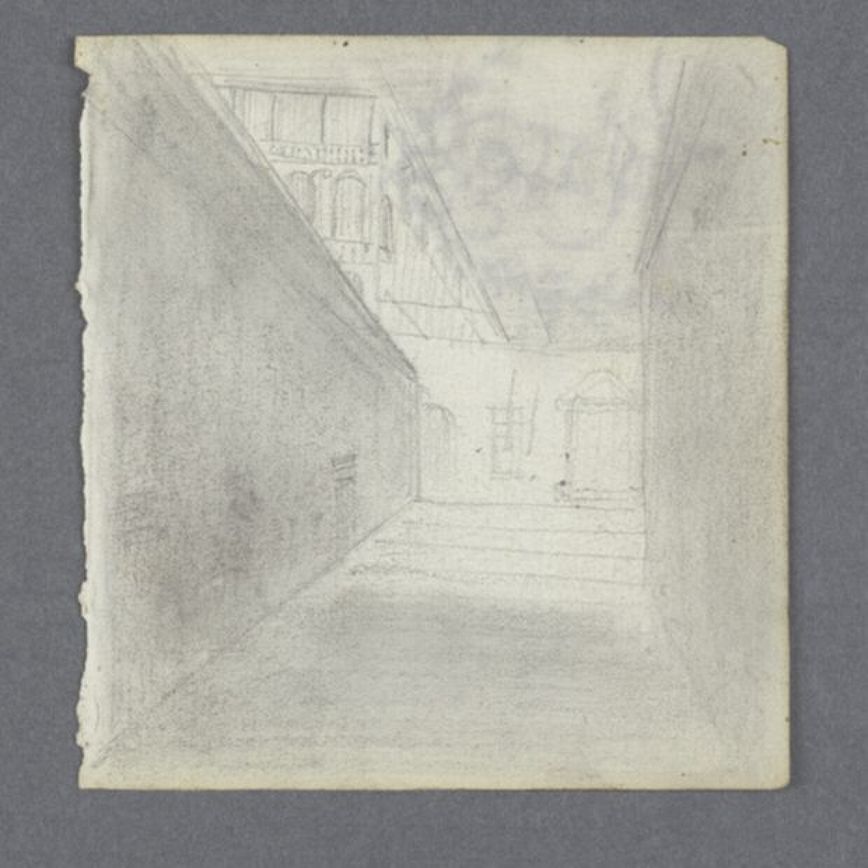 Potloodschets (recto) en schets in bruine inkt (verso) op klein papierformaat, getekend door Jan Garemijn. Het los blad was oorspronkelijk ingebonden, samen met de andere 23 schetsblaadjes uit deze reeks. De schetsen werden eerder bewaard bij Garemijns notitieboekje 0000.GRO1676.7.II uit 1773-1774 toen hij directeur was van de Brugse Academie. Recto: lijntekening van een stadszicht in lineair perspectief. De tekening toont een locatie tussen twee muren die uitloopt op een lage aanbouw met twee deuropeningen. De rechterdeur vertoont een driehoekig fronton boven de opening. De linkerdeur is gevat in een rondboog. Achter dit huis is een hoger diephuis (mogelijks een palazzo) te zien met meerdere verdiepingen en balustrades voor de ramen. Er zijn rondboogvormige raamopeningen op de middelste verdiepingen. Het gebruikte medium is grijs potlood en gewassen inkt. Verso: technische tekening (penseel in bruine inkt) die deels vervaagd is. Het gaat mogelijks om houten latten die samen een A-frame constructie vormen, met een tweetal bevestigingsassen of scharnieren zichtbaar op de kruising van de latten. Links is nog een rond element geschetst, misschien een katrol of een wiel. Rechts bovenaan zijn een aantal rechte elementen weergegeven.