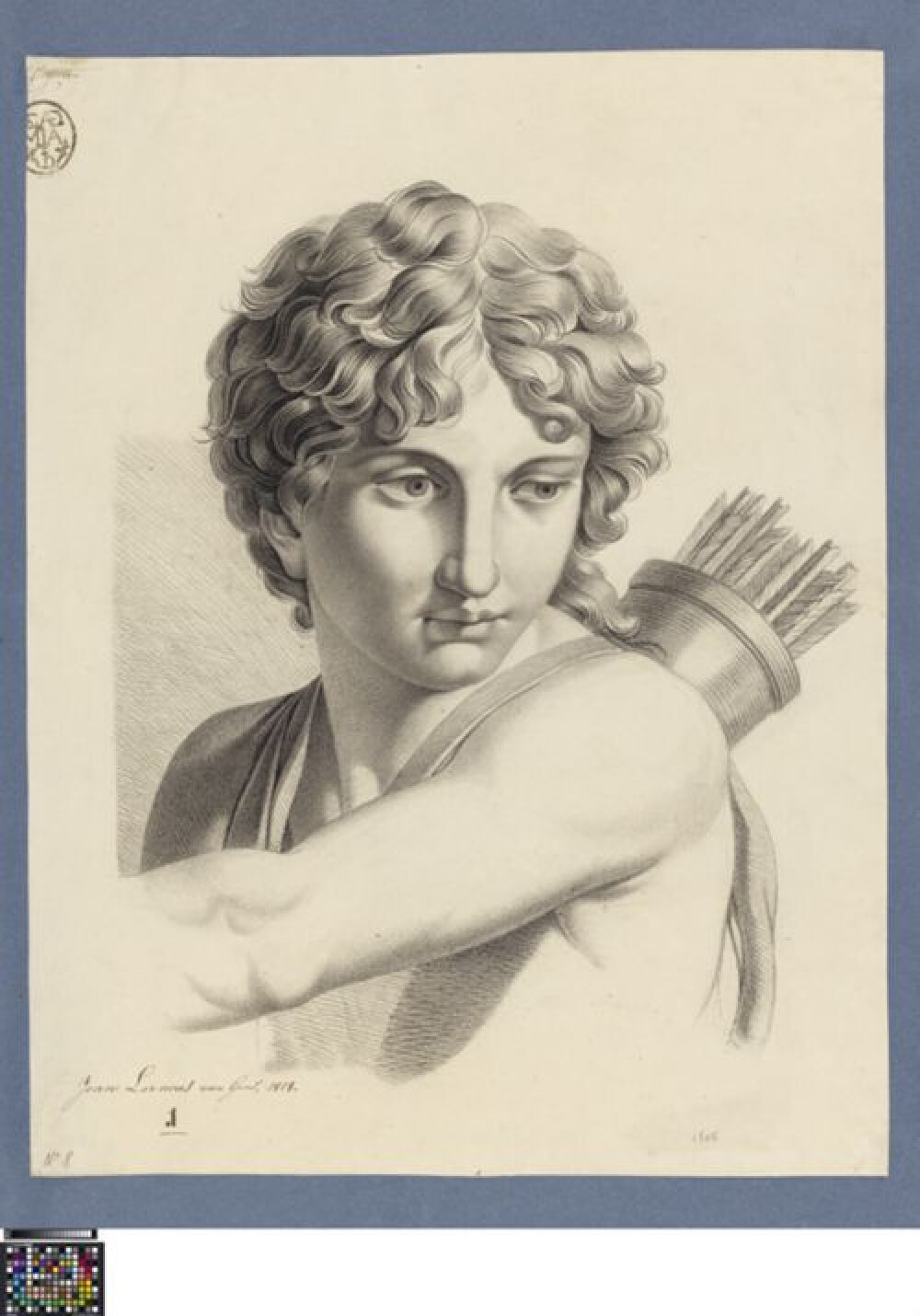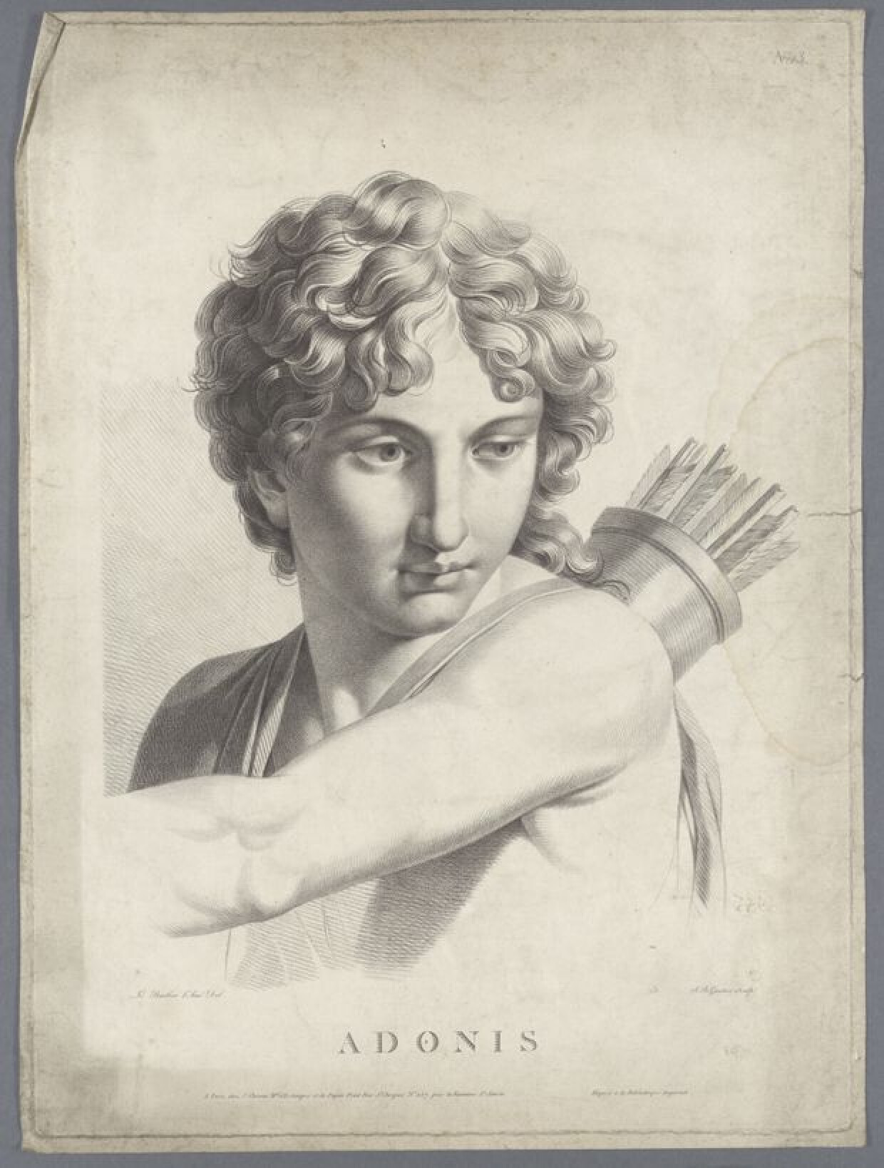 Academische prent getiteld "Adonis", gegraveerd door Gautier naar tekening van Le Barbier. De jonge god wordt als jager afgebeeld met een pijlenkoker op zijn rug, bevestigd met riemen. Hij is van hoofd tot borsthoogte weergegeven met halflang krullend haar. Zijn gezicht is driekwart naar rechts gekeerd en hij houdt de linkerarm gestrekt voor de borst. Het gaat om een stippelgravure in zwarte inkt. De vervaardigingsdatum kan geschat worden tussen 1805 en 1815. In deze periode werd de Bibliothèque Nationale de France omgedoopt tot Bibliothèque Impériale, zoals rechtsonder op de prent is aangegeven.