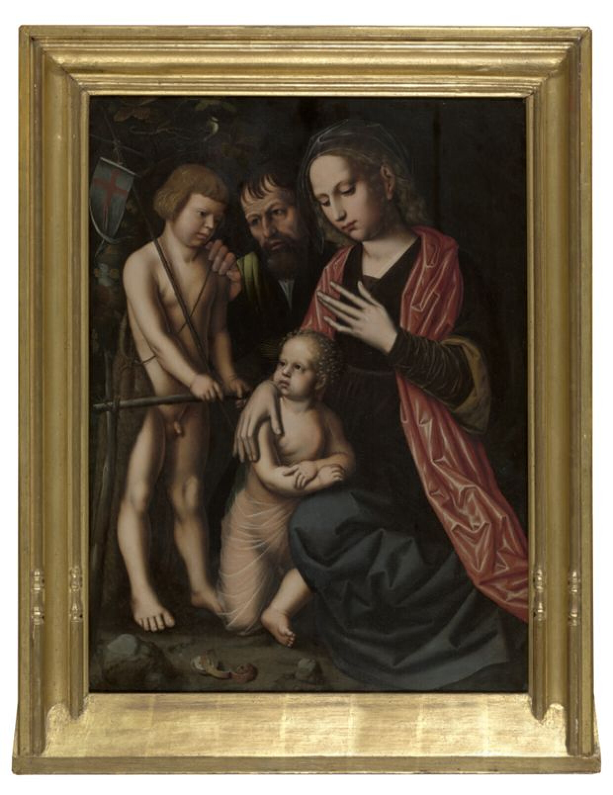 An unremarkable little bird at the top-left of the painting is witness to a peaceful moment between the Holy Family and John the Baptist, who are resting at the edge of a forest. The image completely fills the frame so there is little room for anything other than the figures in this intimate scene. The additional motifs, such as the bird, must therefore have been depicted by Benson for a reason. In early Netherlandish painting, when Mary and Child are portrayed with a bird it is usually a goldfinch. Legend has it that the little goldfinch plucked a thorn from Christ’s forehead during his procession to Calvary. As a result, a drop of the Saviour’s blood fell onto the goldfinch’s head, hence its characteristic red spot. The bird depicted in Benson’s painting, however, is not a goldfinch but a great tit. Why Benson deviated from the usual iconography is not known, perhaps he wanted to convey a different message that is now lost.