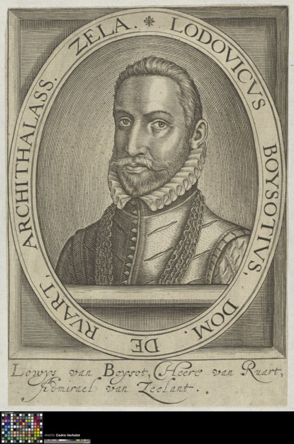 17de eeuwLouis de Boisot (Brussel, ca. 1530 - Oosterschelde, 1576), afkomstig van Brabantse adel, was een admiraal van de Zeeuwse geuzenvloot tijdens de Tachtigjarige Oorlog. Daarenboven was hij heer van Ruart (Nijvel). Het is een busteportret waarin hij wordt afgebeeld met kort haar en een snor. Hij draagt een harnas. Hij bevindt zich achter een borstwering in een ovalen omlijsting met Latijnse inscriptie. In de marge onderaan is een tweeregelig opschrift te lezen. De prent maakt deel uit van een reeks portretten van Emanuel Van Meteren gepubliceerd in "Historie der Nederlandscher ende haerder na-buren oorlogen ende geschiede [...]" (Den Haag, 1614), met dezelfde formele behandeling. Het is een illustratie uit een niet-geïdentificeerde editie van Emanuel van Meteren's "Historie der Nederlandscher ende haerder na-buren oorlogen ende geschiede [...]". De prent maakt deel uit van het album met (losse) portretten uit de 16de en 17de eeuw (2014.GRO0019.III).