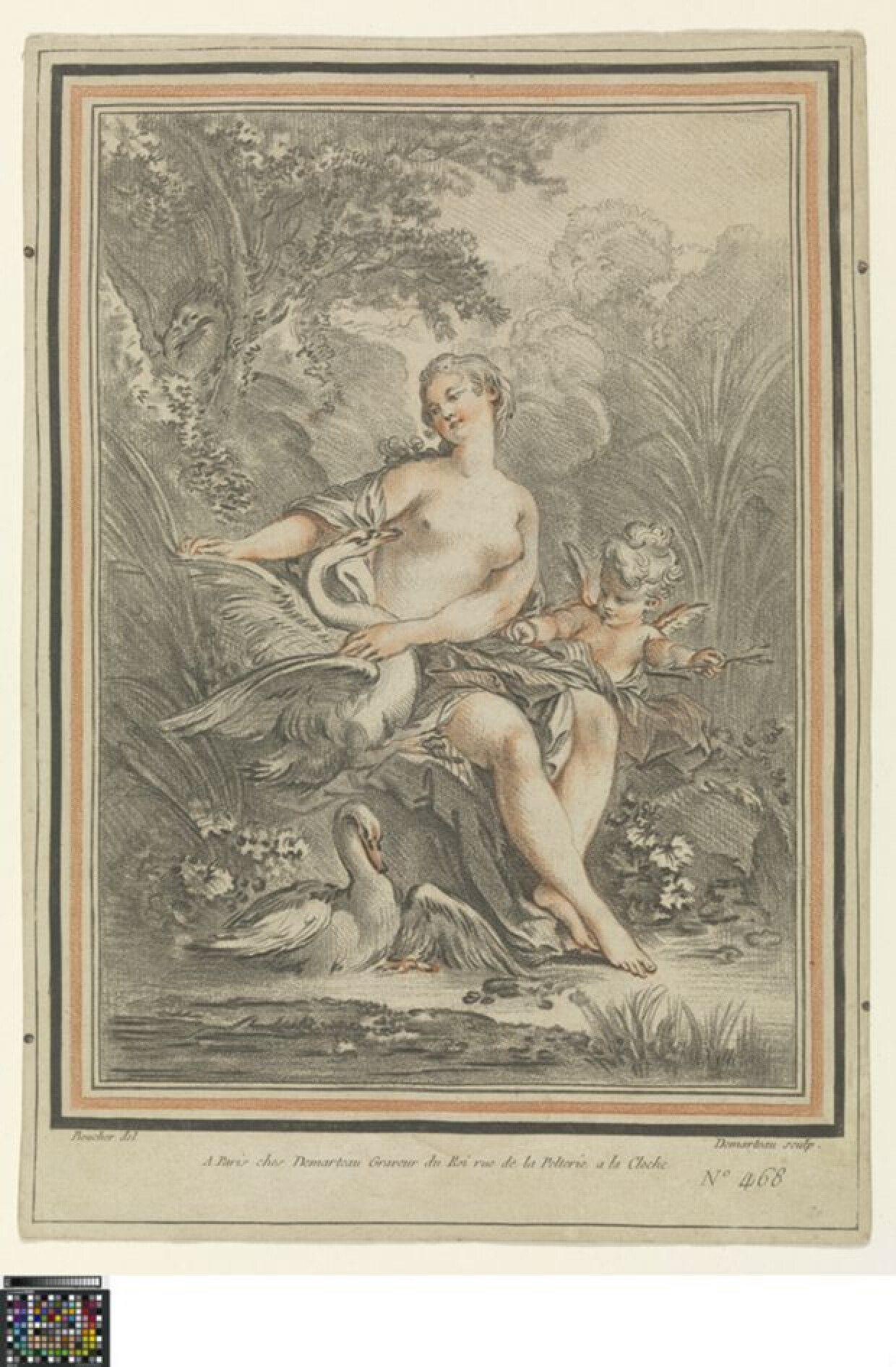 18de eeuwLeda is halfnaakt zittend aan het water weergegeven, met in haar handen een zwaan. Een andere zwaan rust op het water. Rechts achter Leda een jonge cupido met pijl.