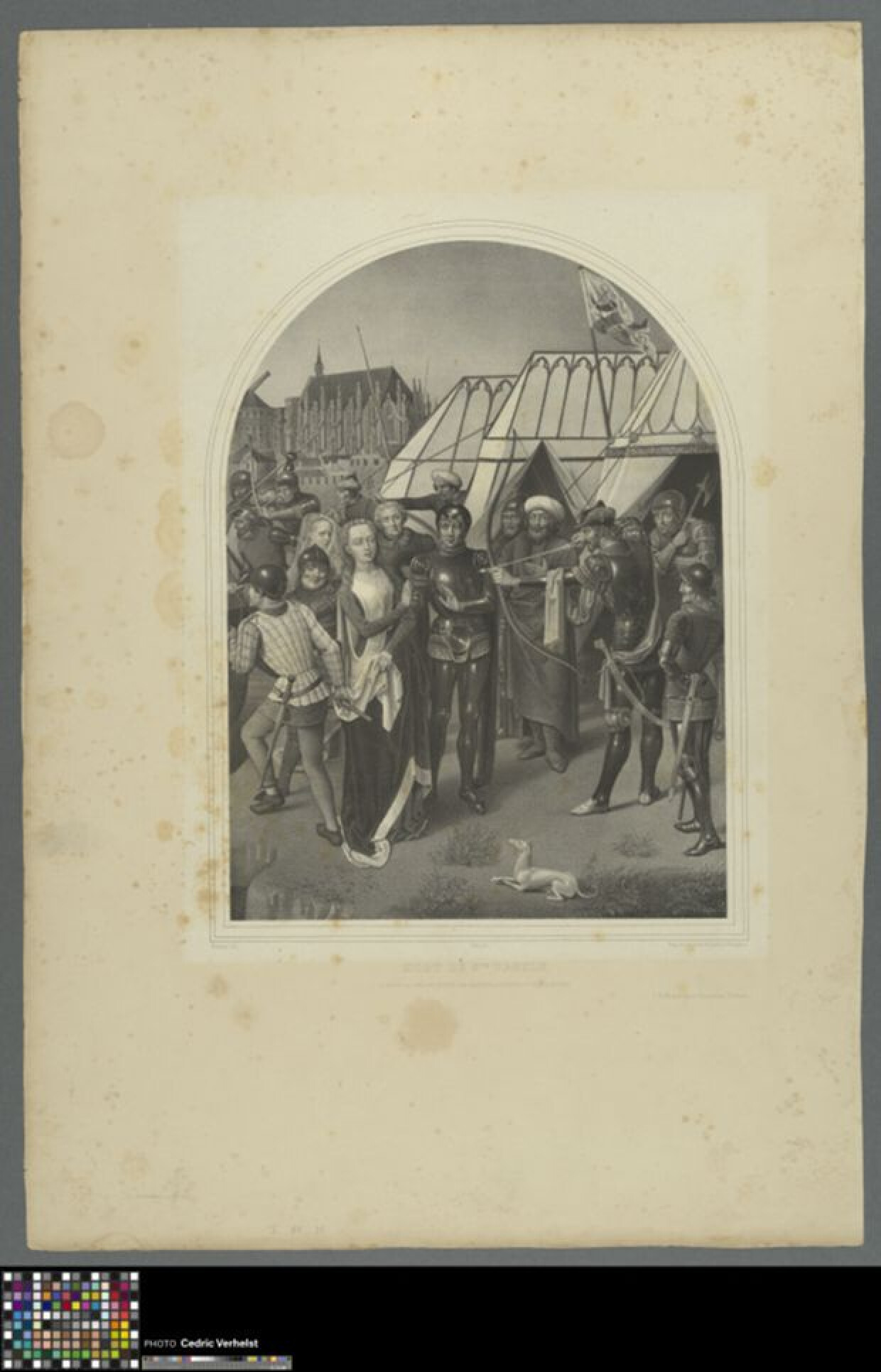 19de eeuwPrent naar het Ursulaschrijn van Hans Memling. Dit is de vierde plaat uit het album: Châsse de sainte ursule par jean memling: Composé & lith. par Manche & Ghémar, Bruxelles J. Buffa & Bogaert-Dumortier [1841]. We zien de dood van de heilige Ursula. Memling wilde de dood van Ursula niet laten zien; hij stopte precies op het moment dat de boogschutter de pijl gaat schieten. Alle vijftien platen uit dit album, behalve de tweede plaat met een portret van Memling en de vijfde plaat met de voorstelling van ‘Arrivée de Ste Ursule à Rome' behoren tot de collectie. Er zijn ook zes tekstbladen aanwezig.