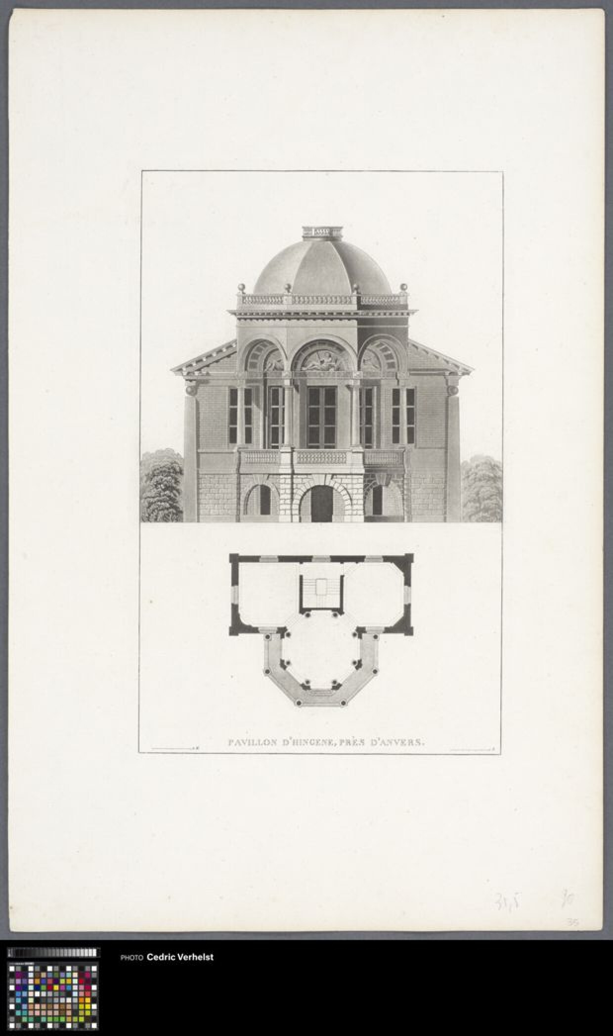 19de eeuwPrent met de achtergevel van het Paviljoen De Notelaer. Deze prent toont de achtergevel van het Paviljoen De Notelaer. Het gebouw staat aan een dijk van de Schelderivier, waardoor kant met de voorgevel voorgevel anderhalve verdieping meer telt dan het deel dat zich aan de dijk bevindt. Onder de koepel is en rond salon ingericht, van waaruit men over de Schelde uit kan kijken. In de rondbogen boven de vensters van dit salon zijn drie van de vijf bas-reliëfs te zien: deze beelden de rivieren de Rupel, de Leie, de Schelde, de Dender en de Durme uit. In de witruimte onder de voorstelling van het paviljoen, waar de dijk zou liggen, is een plattegrond van het gebouw weergegeven. Dit grondplan toont het achthoekige salon aan de kant van de Schelde, en de trappenhal tussen twee ruimtes aan de voorgevel. Het paviljoen is genoemd naar een grote notelaar op deze plek, die diende als herkenningspunt voor de schippers. In de benedenverdiepingen waren een herberg en veerdienst gevestigd, en de woning van de conciërge. De bovenverdieping met het ronde salon werd als belvédère gebruikt door de familie van de hertog Wolfgang-Willem d’Ursel (1750-1804). De familie ontving er gasten of organiseerde er jachtpartijen.