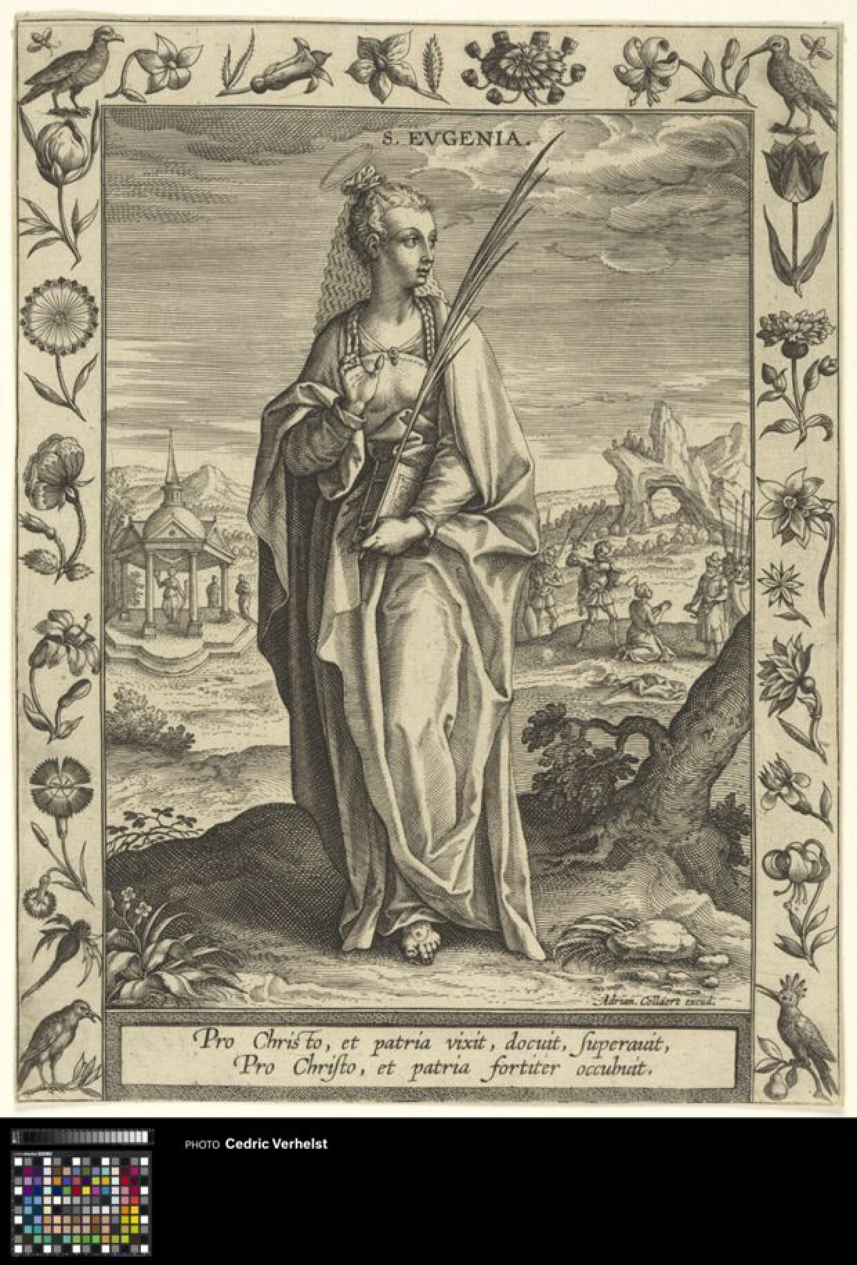 16de eeuw 17de eeuwBijbelse voorstelling van de Heilige Eugenia. Zij is voluit afgebeeld in een landschap. Boven haar hoofd zweeft een aureool. Ze draagt een lang gedrapeerd gewaad, dat haar van schouders tot voeten bedekt. Boven haar hoofd zweeft een aureool. Aan haar opgestoken haren hangt een sluier. Haar linkerhand houdt ze met de palm naar voren voor haar borst, met de rechter houdt ze een dik boek vast en een palmtak. Haar rechtervoet steekt ze vooruit, onder de jurk vandaan, zodat een wonde op haar voet te zien is. Op de achtergrond is een landschap te zien. Aan de linkerkant is een klein gebouwtje afgebeeld met een figuur erin. Aan de rechterkant zien we aantal figuren die op het punt staan iemand te onthoofden. De hele voorstelling is omring door een bqnd, gedecoreerd met vogels en bloemen. Onder de voorstelling staan twee regels in het Latijn. De prent is deel van een serie van vierentwiting prenten van vrouwelijke martelaressen. De serie was opgedragen aan Margaretha van Oostenrijk en werd door Laurens Beyerlinck voorzien van verzen in het Latijn.