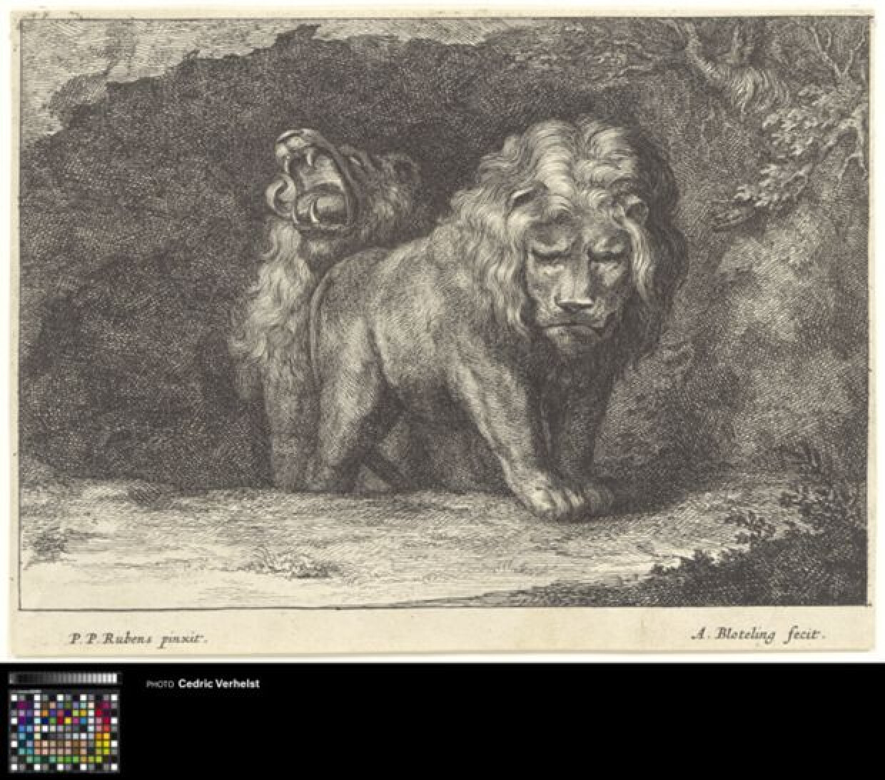 17de eeuwDeze ets beeldt twee leeuwen af die uit een grot komen. De prent is gemaakt naar een schilderij van Peter Paul Rubens, dat het bijbelse verhaal van Daniël in de leeuwenkuil voorstelt. De leeuwen in de ets zijn het spiegelbeeld van de leeuwen op het schilderij. Vooraan is een leeuw te zien met het lichaam naar rechts gedraaid. Achter hem, met de kop naar links, staat een gapende leeuw met zijn muil wijd open.