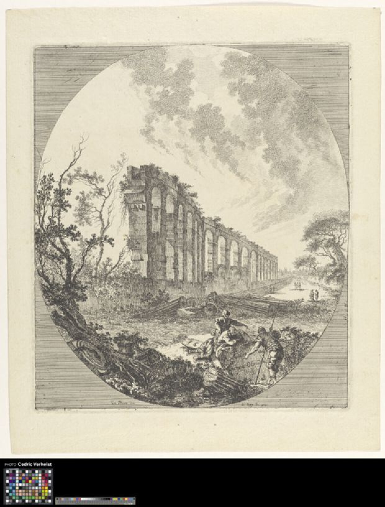 18de eeuwDe voorstelling toont de ruïnes van de Acqua Claudia, een van de aquaducten die Rome van water voorzagen. Het Aquaduct is in perspectief afgebeeld langs een weg. Er liggen enkele zuilen op de grond. Vooraan zijn drie soldaten afgebeeld. Op de weg lopen een aantal mensen. In de verte is een stadje te zien.