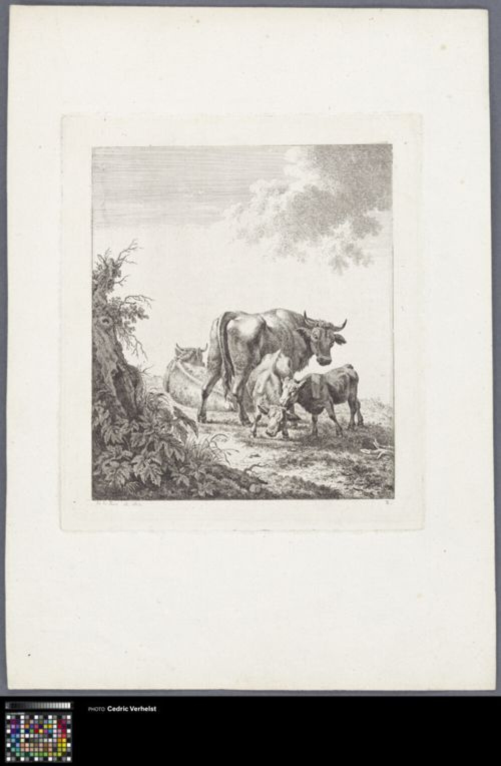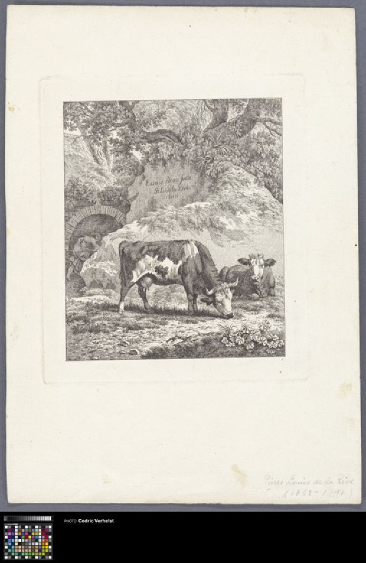 19de eeuwEts van twee koeien in een landschap. Maakt deel uit van een reeks van 8 prenten met landelijke taferelen van koeien of geiten. Pierre-Louis De la Rive was één van de grondleggers van de Zwitserse landschapsschilderkunst.