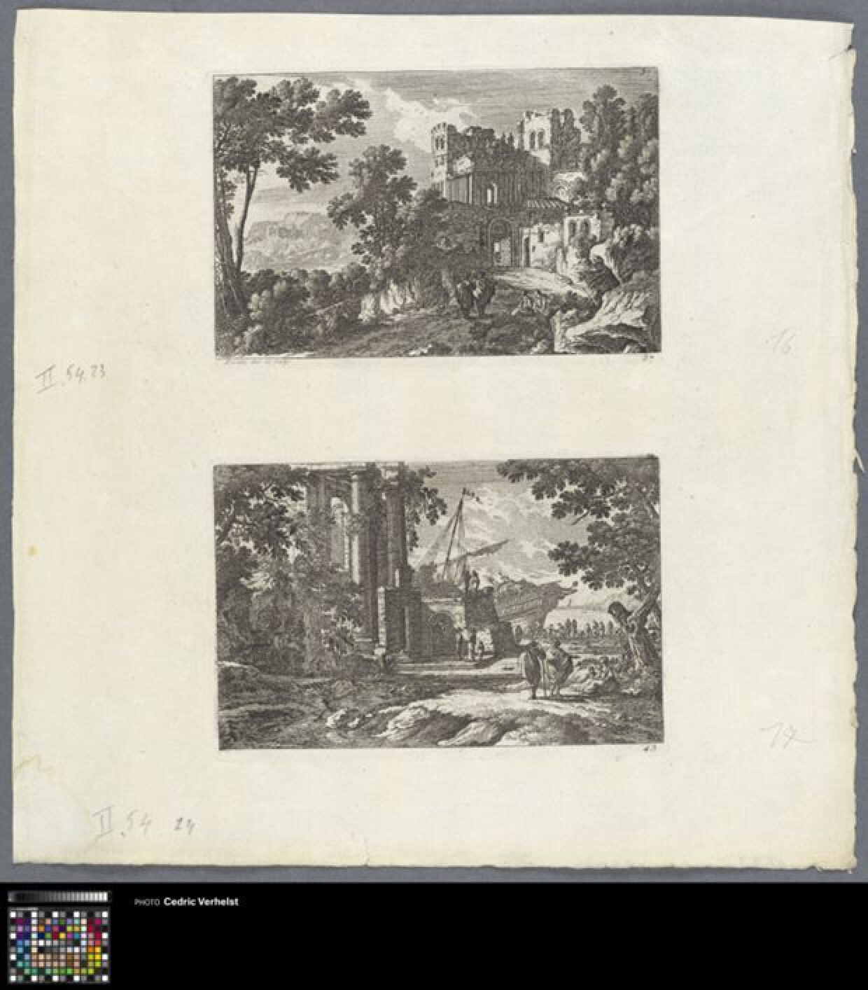 17de eeuwDe bovenste prent betreft een landschap met twee wandelende mannen en twee zittende vrouwen. Achter hen ligt een ruïne van een groot landhuis, tussen de rotsen en bomen. De onderste prent toont een gebouw met ionische zuilen, met erachter een groot schip. Figuren groeperen zich om te converseren of om het schip te laden of te lossen. Links en rechts staan bomen.
