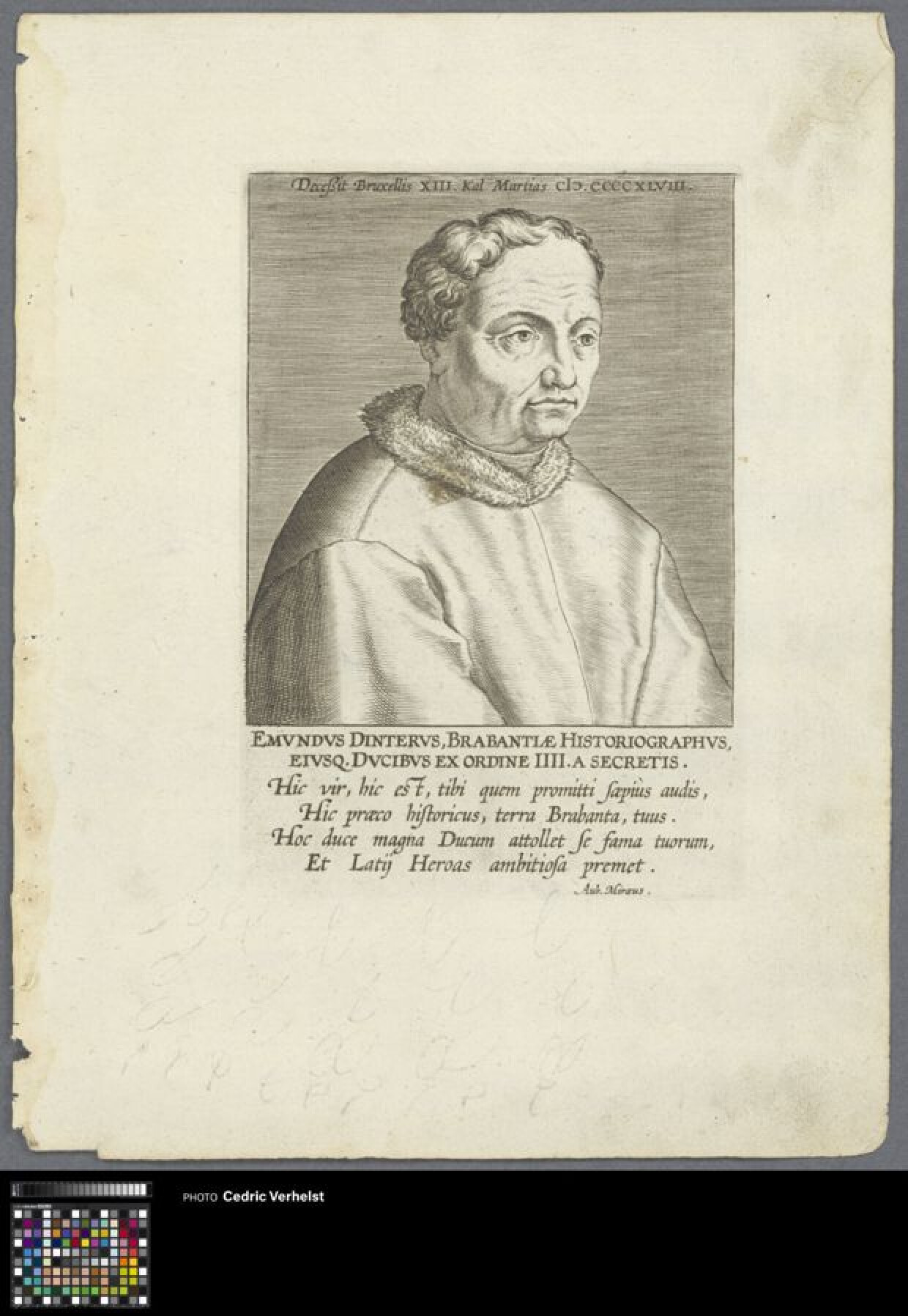 18de eeuwPortret van geschiedschrijver Edmund van Dinter in buste naar rechts. Gebruikt als boekillustratie in o.a.: Joannes Franciscus Foppens, Bibliotheca Belgica, sive: Virorum in Belgio vita, scriptisque illustrium catalogus, librorumque nomenclatura, Brussel 1739, deel 1, p. 261.