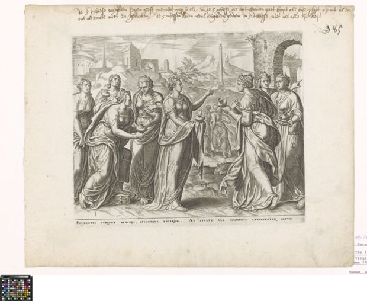 16de eeuwLinks zijn de vijf wijze maagden voorgesteld die olie in een lamp gieten en een lamp hebben branden. Drie dwaze maagden rechts vragen de wijze maagden om olie. Tussen hen in zijn twee dwaze maagden van op de rug voorgesteld die extra olie halen. De prent is de derde in een vierdelige reeks over de parabel van de wijze en de dwaze maagden (New Holl. Harmen Jansz. Muller (45-48, 47). De prent is gemaakt door Herman Muller naar Gerard van Groeningen. In de marge een opschrift in het Latijn.