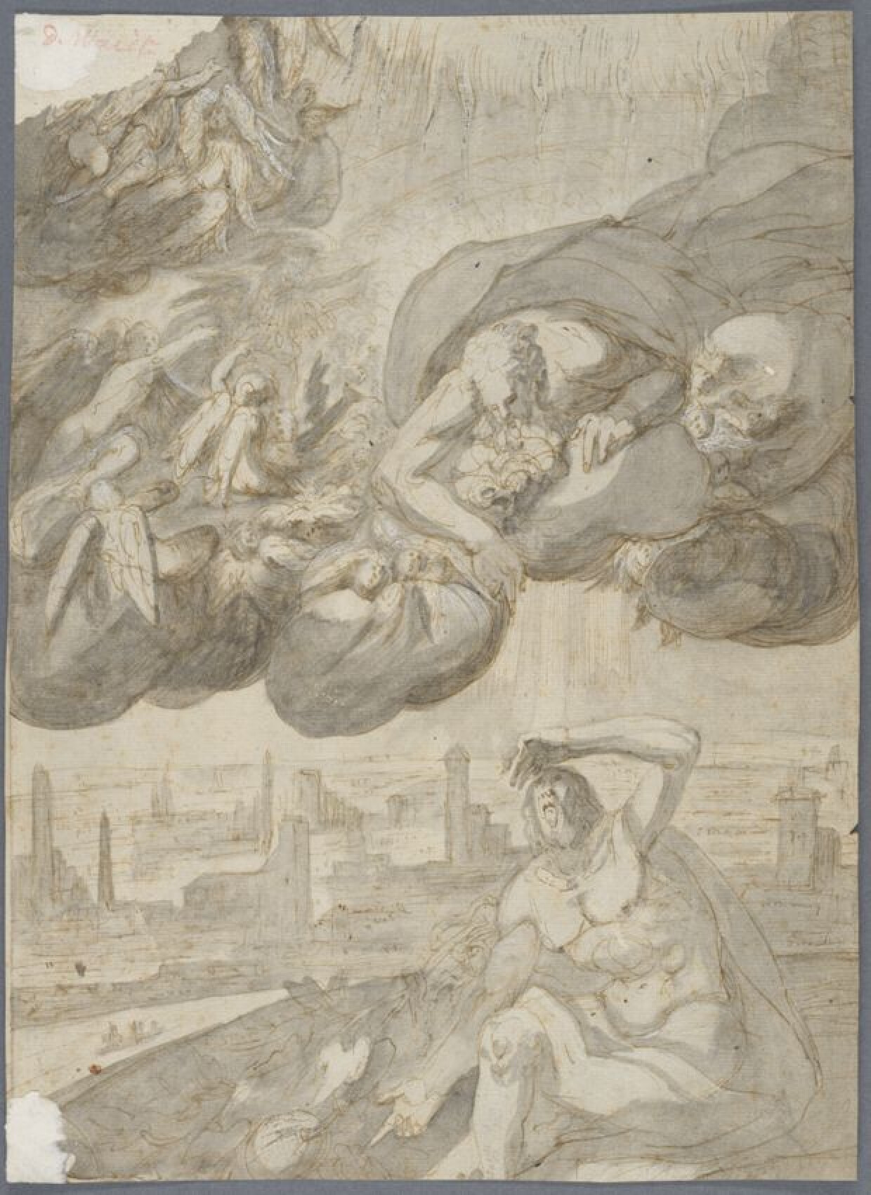 17de eeuwRecto: de voorstelling beeldt een scène af uit het Oude Testament (Jona 4:8 – 11). De profeet Jona bevindt zich aan de oostzijde van de stad Nineve, aan de oever van de Tigris. God spreekt tot Jona vanuit de wolken en berispt hem. Jona zit op de voorgrond en kijkt naar boven. Met zijn rechterhand maakt hij een wijzend gebaar, terwijl hij met zijn linkerhand het licht van de zon probeert tegen te houden. Boven hem is God afgebeeld op een wolk. Hij kijkt naar beneden en wijst naar Jona. Rond God zijn er verschillende engelen getekend, die zich ook tussen en op de wolken bevinden. Op de achtergrond is de stad Nineve afgebeeld. De nadruk ligt op de tweespraak tussen God en Jona. Verso: “Aanschouwt de vogelen des hemels…”. Christus maant de mens tot godsvertrouwen door hem te vergelijken met de vogels en de bloemen. De scène is ontleend aan Lucas 12:24-28 of Mattheus 6:26-30 uit het Nieuwe Testament. De tekening op de versozijde is voornamelijk in pen en grijsbruine inkt uitgevoerd. Hier en daar zijn transparante wassingen aangebracht. De compositie is op een tamelijke schetsmatige manier, in de breedte, weergegeven. De penvoering is losser dan wat gewend is in het oeuvre van de meester. Karakteristiek is de schematische wijze waarop de compositie-elementen op de achtergrond zijn aangeduid. Dit wordt bestendigd met de hulp van scherpe penlijnen. De tekening op de rectozijde is door de meester met meer zorg uitgewerkt dan die op de verso; de grijze wassingen zijn in verschillende gradaties opgebracht. De recto toont een interessante combinatie van tekenstijlen. In beide voorstellingen bewerkstelligen de heftige armgebaren van de engelen een centripetale beweging. De gezichten zijn daarenboven op identieke wijze vorm gegeven. De combinatie van stijlkenmerken zorgt ervoor dat de tekening als verbindende schakel fungeert tussen de pentekeningen die traditioneel aan de Meester van de Egmont Albums worden toegeschreven en de kleine groep van gewassen tekeningen van het “Département des Arts Graphiques”. De tekening is in langdurig bruikleen van de Stichting Jean van Caloen (inv. nr. VCL 1801). Gebaseerd op: Gert-Jan Van der Sman in “Delineavit & Sculpsit”, nov. 1997, nr 2.