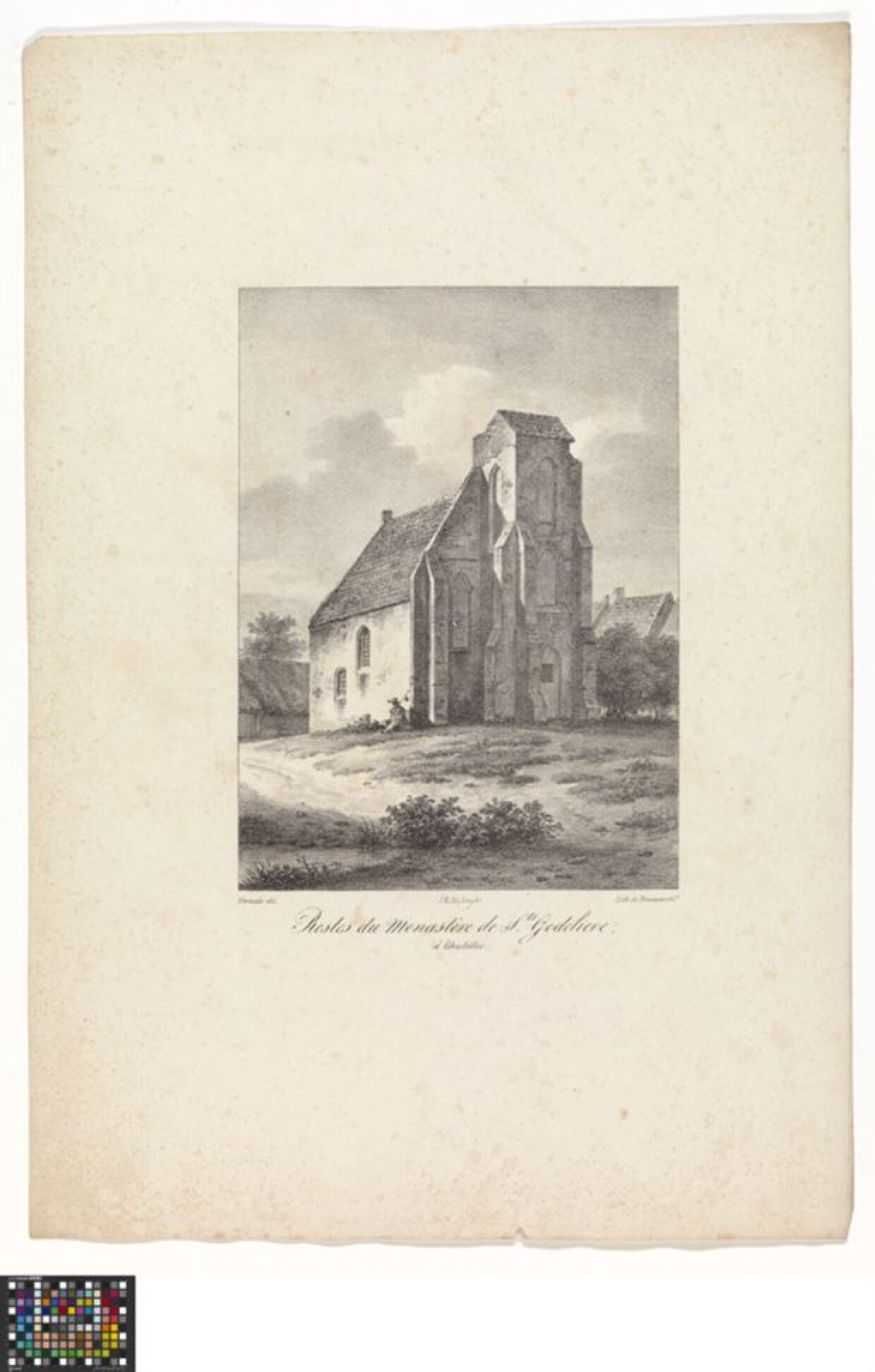 19de eeuwPrent van papier, 'Restes du Monastère de Ste Godelieve, à Ghistelles'. Litho van J. B. De Jonghe, naar een tekening van Vermote en gedrukt door de Dewasme et Cie. Deze lithografische prent komt ook voor in het boek 'Collection historique des principales vues des Pays-Bas, dédiée au Roi', uitgebracht in 1823-1824. Op de prent staan de ruïnes van het klooster van St. Godelieve. Tegen een zijgevel rust een iemand uit met hoed en knapzak.