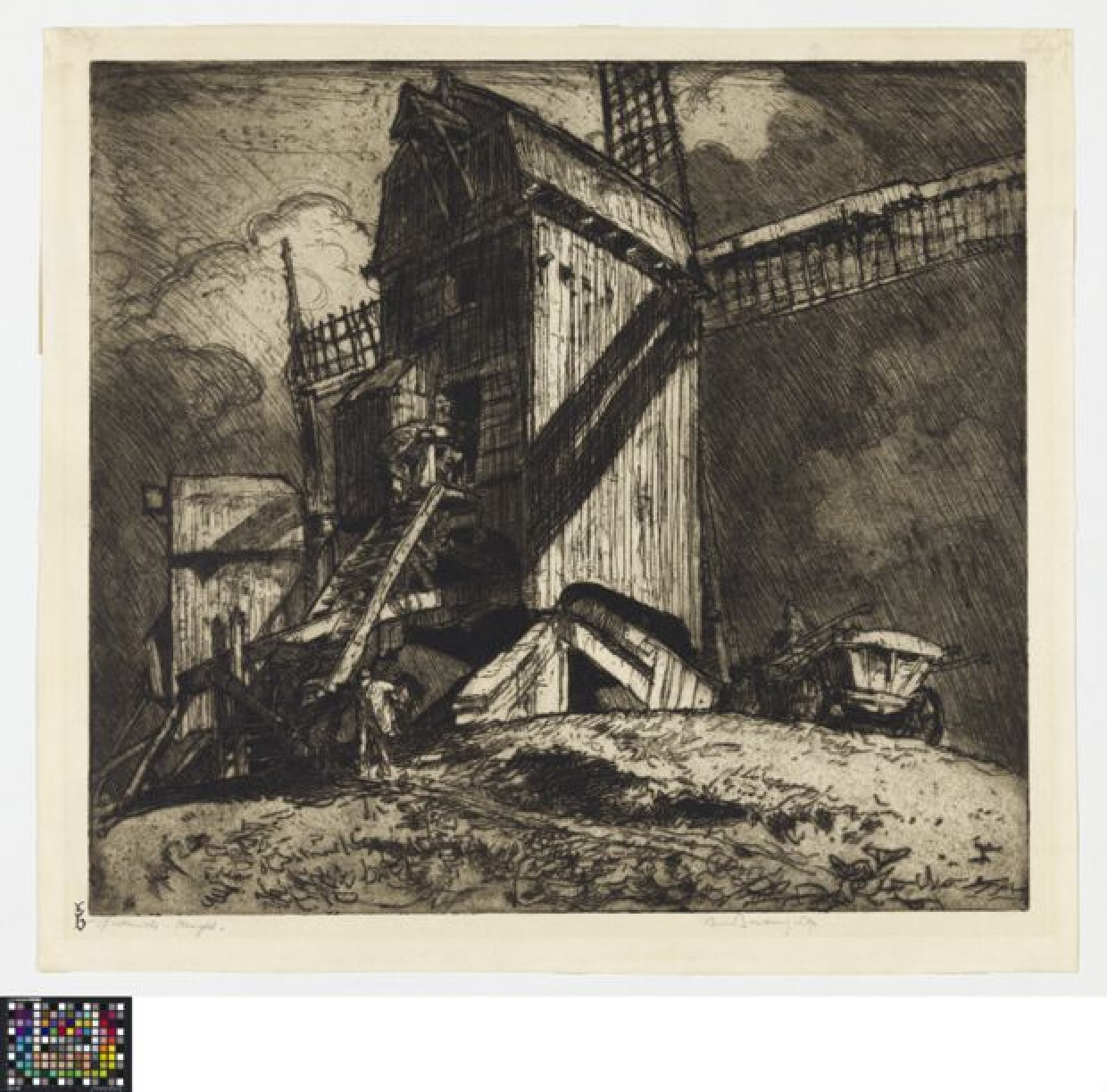 Voorstelling van twee windmolens op heuveltjes bij de Kruispoort te Brugge. Mannen dragen zakken graan naar de dichtst bijgelegen molen, terwijl een voorman met kar de hoogte afrijdt. De plaat werd naar een tekening geëtst. Ook de gelijkaardige houtsnede in het boek 'Belgium (Londen, 1916, p. 23, pl. 12) werd door H. G. Webb naar voornoemde studie gesneden. Dezelfde molens komen tevens voor op één van de muurschilderingen die Brangwyn in 1914 schilderde voor de Panama Pacific International Exposition in San Francisco (V.S.).