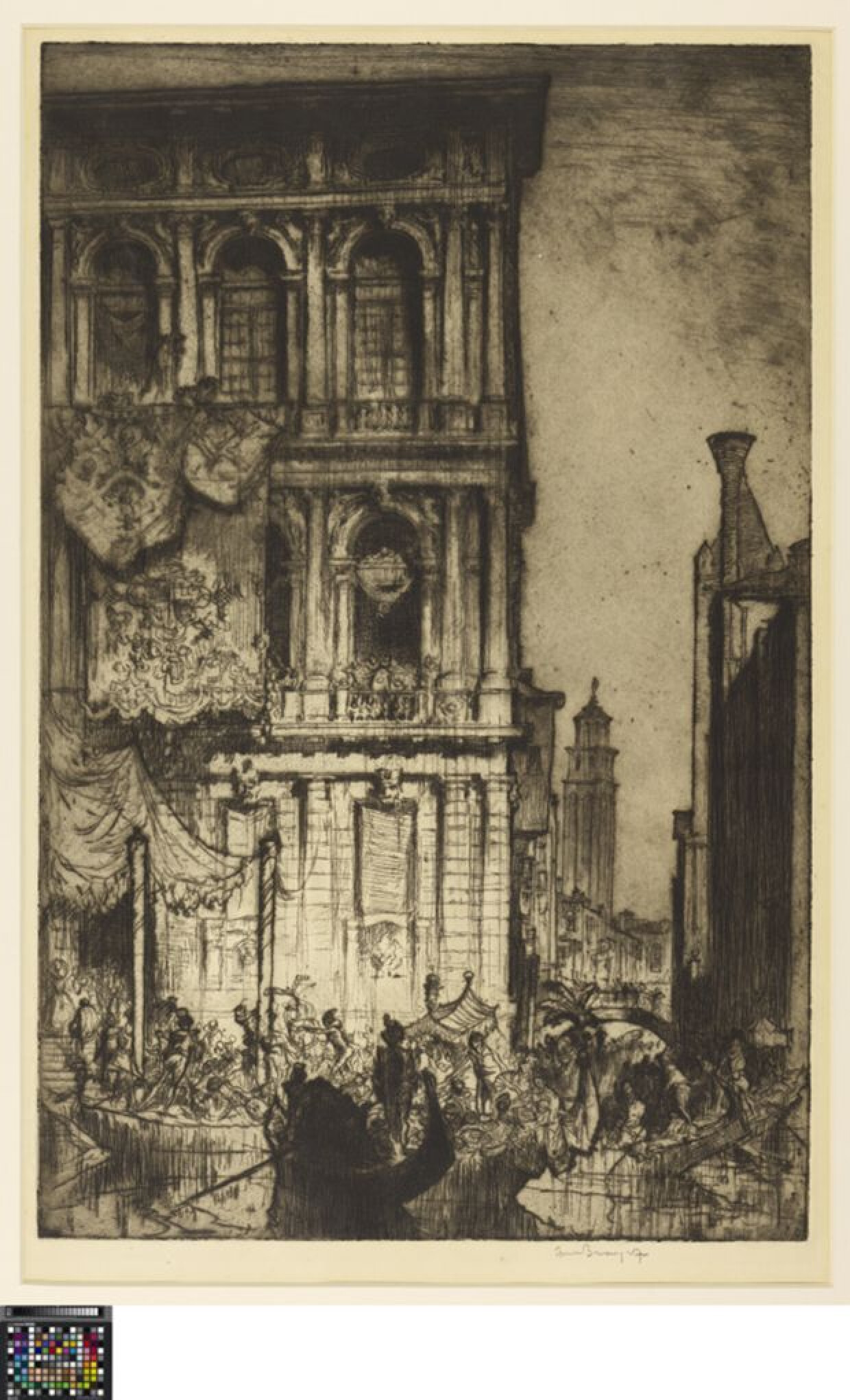 Vele opgetooide gondels brengen genodigden in achttiende-eeuwse (?) kledij naar een feest in het palazzo Rezzonico op het Canale Grande te Venetië, waar de Britse dichter Rober Browning in de negentiende eeuw vertoefde. Een zijkanaal, met huizen erlangs, verleent een perspectivistische doorbraak. Op de achtergrond een kerktoren en een brugje waarop nieuwsgierigen staan te kijken. De plaat werd geëtst naar een waterverfschilderij. In 1908 zijn er plannen geweest om in het voornoemd gebouw door Brangwyn een aantal decoratieve panelen te laten schilderen, met de voorstelling van de maanden.