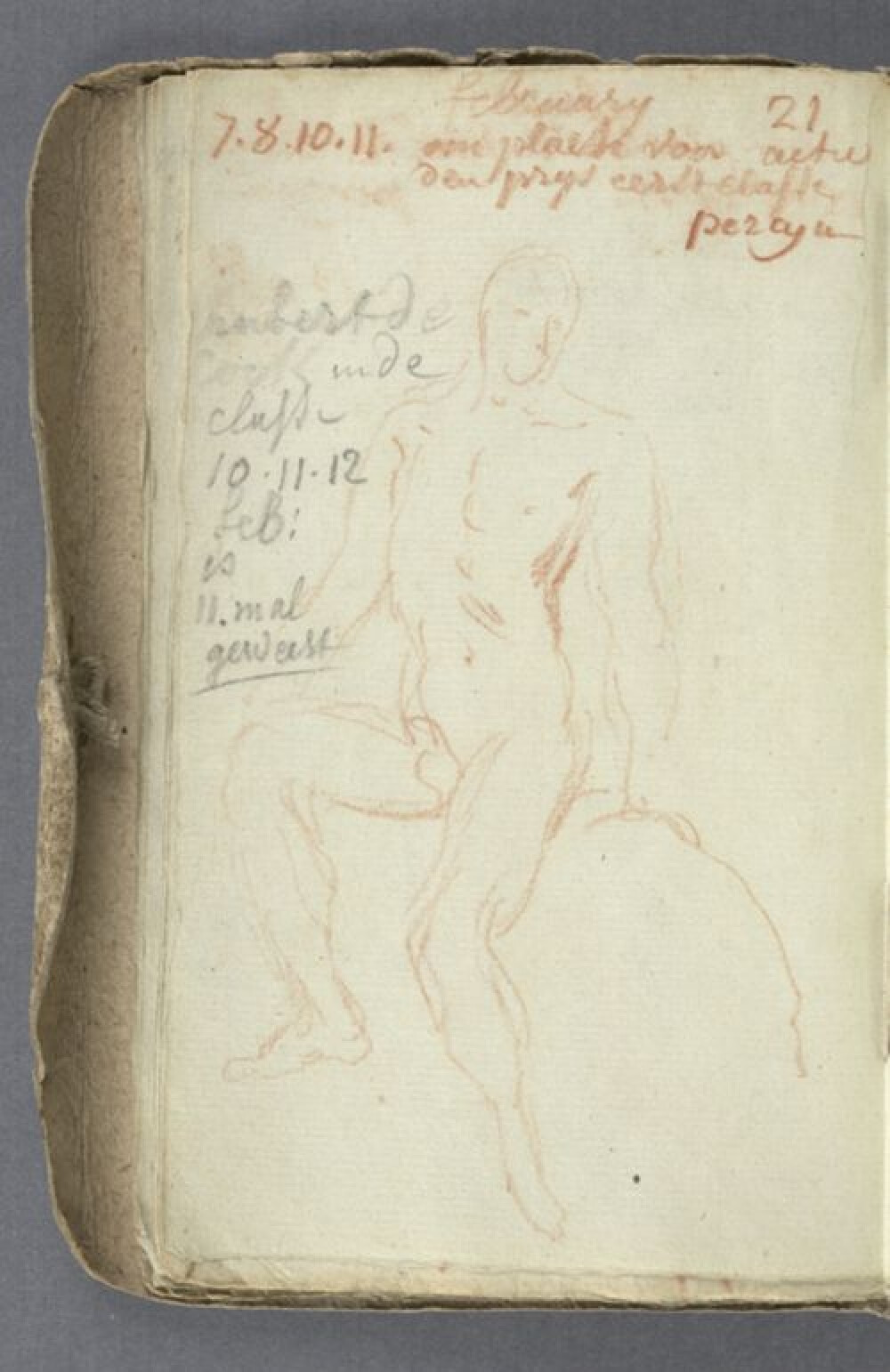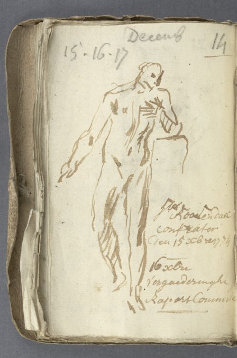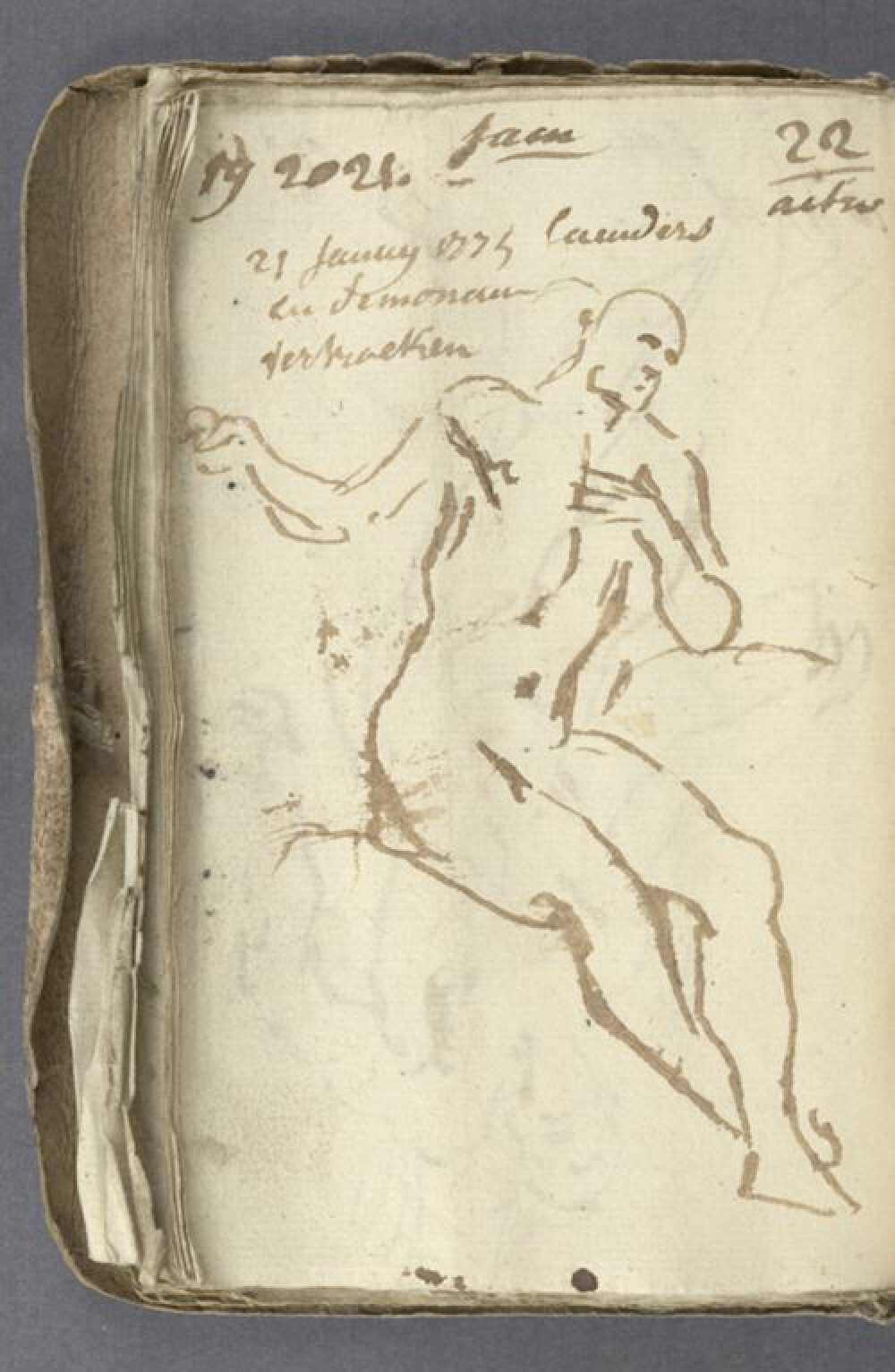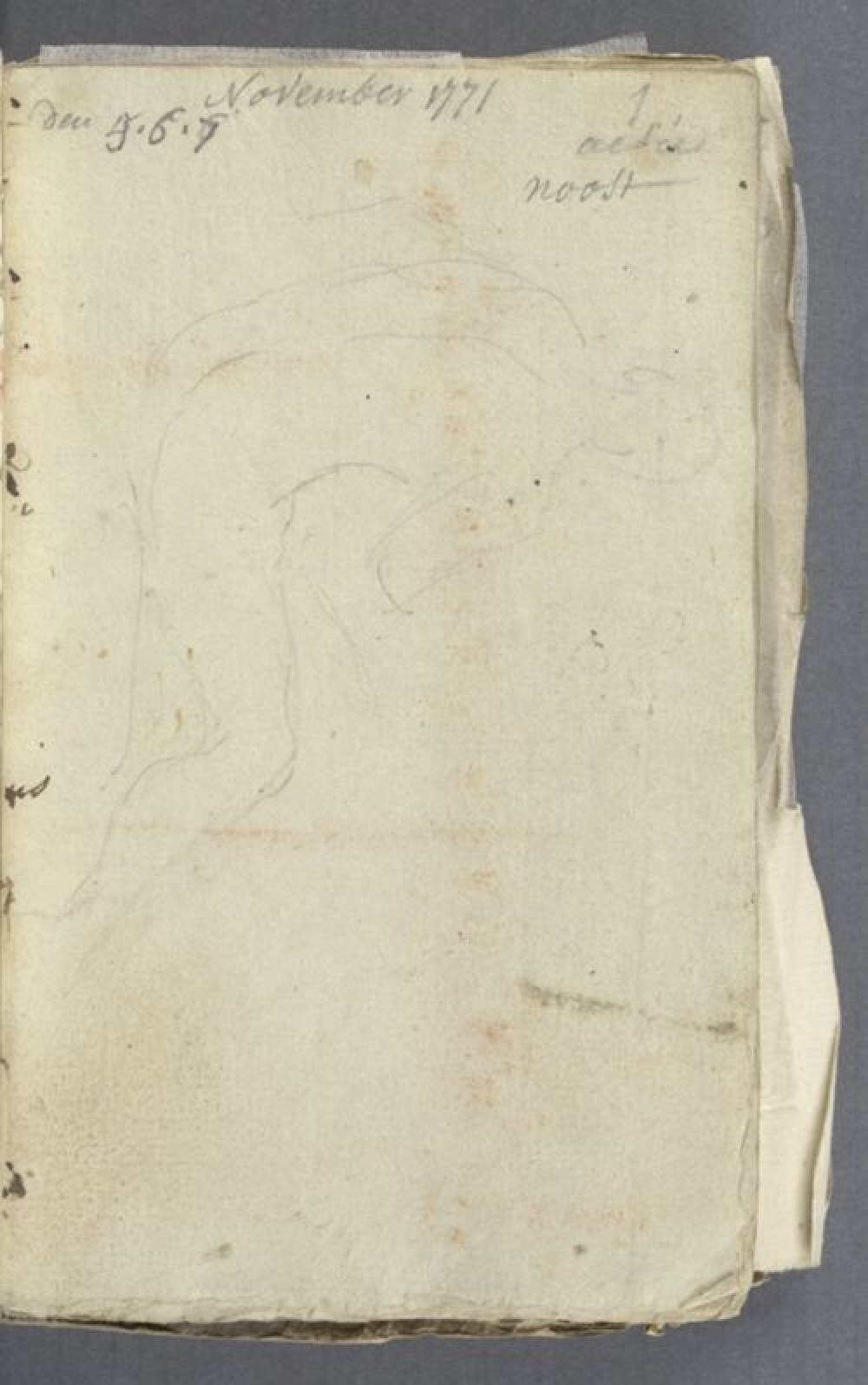18de eeuwNotitieboekje van Jan Garemijn als directeur van de Academie Brugge, daterend van 1771-1775. Het boekje bevat informatie over de schooljaren 1771-1772 en 1774-1775. Het gaat om 54 folio’s, in vier katernen samengebonden tot een schriftje met een kartonnen omslag. Aan de flap van het voorplat is nog de restant van het touwtje te zien dat als sluiting diende. Garemijn gebruikte het enerzijds als schetsboekje, maar hij maakte er ook aantekeningen in. De gebruikte schrijf- en tekenmedia variëren. Er is zowel rood krijt, potlood, bruine inkt, als zwart krijt of houtskool gebruikt. De bladzijdes bestaan uit gevergeerd papier. Het boekje heeft een iets andere opbouw dan de andere notitieboekjes omdat informatie over twee schooljaren bevat. De eerste bladzijden zijn verbonden aan het schooljaar 1771-1772. Ingeleid door twee leerlingenlijsten, wellicht van de eerste wedstrijd om plaatsen in november, volgen de schetsen die Garemijn maakte tijdens de poseersessies in de klas naar model. De acties van de naaktmodellen werden snel op papier gezet. Hij gebruikte hiervoor steeds een enkel medium: rood krijt of grijs potlood. De laatste tekeningen van het schooljaar zijn gelinkt aan de wedstrijd om prijs. Deze schetsen zijn in bruine inkt of potlood gemaakt. 1772 was een uitzonderlijk prijsjaar omdat Garemijn toen een van de poses moest aanpassen. Om deze reden komen de bewaarde wedstrijdtekeningen (0016.GRO0034.II;0016.GRO0037.II) overeen met de aangepaste actie 23 (14r-v) en niet met de eerstgekozen actie 22 (13v). Naast de schetsen noteerde Garemijn steeds informatie in de kantlijn. Zo weten we dat er doorheen dit schooljaar twee modellen, quasi afwisselend, poseerden: [Jan] Noost en [Pieter] Percyn. Percyn was wel de enige die voor de prijswedstrijd model stond. Volgend op enkele notities, blanco bladzijdes en een berekening van het aantal lampen in de academie, kondigt een notitie het schooljaar 1774-1775 aan. De lessen vatten aan op 26 oktober, om 17u30 precies. Nadien volgen de schetsen van alle acties die tijdens het schooljaar geposeerd werden. Meestal gaat het om schetsen in potlood of bruine inkt met daarbij de data van de poseersessies. Opvallend is dat de naam van het model steeds ontbreekt... Pas bij de laatste schets van dit schooljaar, geeft Garemijn aan dat Percyn in totaal 107 avonden geposeerd heeft. Hij poseerde dus alle acties gedurende dit schooljaar en ontving hiervoor twaalf stuivers per avond. Na de schetsen volgen opnieuw enkele notities, hoofdzakelijk over het schooljaar 1771-1772. Zo zijn Garemijns plan voor de prijswedstrijd en de 'decoratiën' voor de prijsdeling erg leuke en interessante informatiebronnen (52r-v). Het boekje sluit nog af met twee leerlingenlijsten uit 1774-1775, een van de klas naar model en een van de klas naar sculptuur.