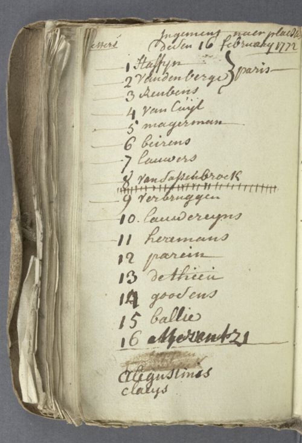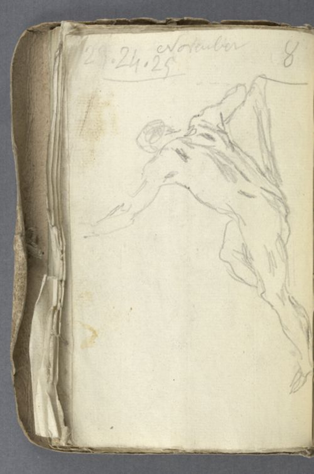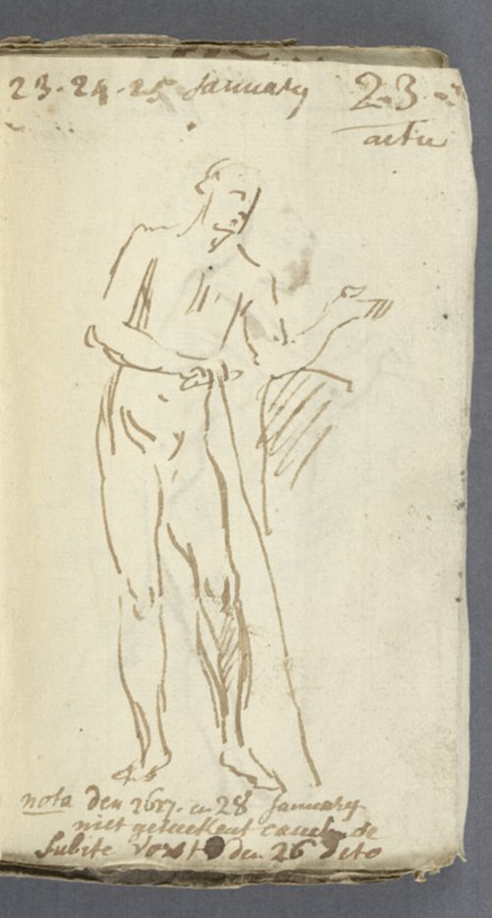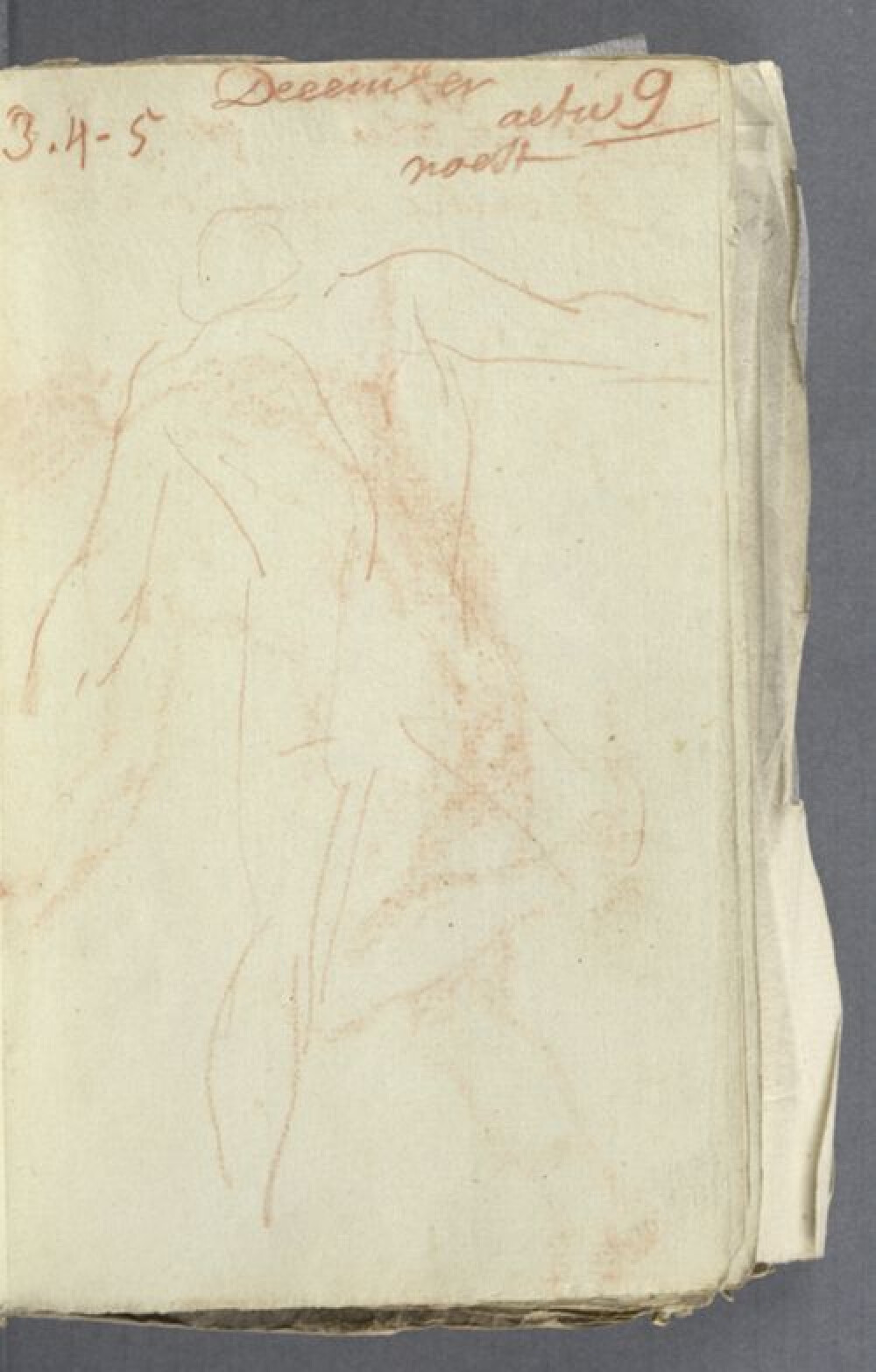 18de eeuwNotitieboekje van Jan Garemijn als directeur van de Academie Brugge, daterend van 1771-1775. Het boekje bevat informatie over de schooljaren 1771-1772 en 1774-1775. Het gaat om 54 folio’s, in vier katernen samengebonden tot een schriftje met een kartonnen omslag. Aan de flap van het voorplat is nog de restant van het touwtje te zien dat als sluiting diende. Garemijn gebruikte het enerzijds als schetsboekje, maar hij maakte er ook aantekeningen in. De gebruikte schrijf- en tekenmedia variëren. Er is zowel rood krijt, potlood, bruine inkt, als zwart krijt of houtskool gebruikt. De bladzijdes bestaan uit gevergeerd papier. Het boekje heeft een iets andere opbouw dan de andere notitieboekjes omdat informatie over twee schooljaren bevat. De eerste bladzijden zijn verbonden aan het schooljaar 1771-1772. Ingeleid door twee leerlingenlijsten, wellicht van de eerste wedstrijd om plaatsen in november, volgen de schetsen die Garemijn maakte tijdens de poseersessies in de klas naar model. De acties van de naaktmodellen werden snel op papier gezet. Hij gebruikte hiervoor steeds een enkel medium: rood krijt of grijs potlood. De laatste tekeningen van het schooljaar zijn gelinkt aan de wedstrijd om prijs. Deze schetsen zijn in bruine inkt of potlood gemaakt. 1772 was een uitzonderlijk prijsjaar omdat Garemijn toen een van de poses moest aanpassen. Om deze reden komen de bewaarde wedstrijdtekeningen (0016.GRO0034.II;0016.GRO0037.II) overeen met de aangepaste actie 23 (14r-v) en niet met de eerstgekozen actie 22 (13v). Naast de schetsen noteerde Garemijn steeds informatie in de kantlijn. Zo weten we dat er doorheen dit schooljaar twee modellen, quasi afwisselend, poseerden: [Jan] Noost en [Pieter] Percyn. Percyn was wel de enige die voor de prijswedstrijd model stond. Volgend op enkele notities, blanco bladzijdes en een berekening van het aantal lampen in de academie, kondigt een notitie het schooljaar 1774-1775 aan. De lessen vatten aan op 26 oktober, om 17u30 precies. Nadien volgen de schetsen van alle acties die tijdens het schooljaar geposeerd werden. Meestal gaat het om schetsen in potlood of bruine inkt met daarbij de data van de poseersessies. Opvallend is dat de naam van het model steeds ontbreekt... Pas bij de laatste schets van dit schooljaar, geeft Garemijn aan dat Percyn in totaal 107 avonden geposeerd heeft. Hij poseerde dus alle acties gedurende dit schooljaar en ontving hiervoor twaalf stuivers per avond. Na de schetsen volgen opnieuw enkele notities, hoofdzakelijk over het schooljaar 1771-1772. Zo zijn Garemijns plan voor de prijswedstrijd en de 'decoratiën' voor de prijsdeling erg leuke en interessante informatiebronnen (52r-v). Het boekje sluit nog af met twee leerlingenlijsten uit 1774-1775, een van de klas naar model en een van de klas naar sculptuur.