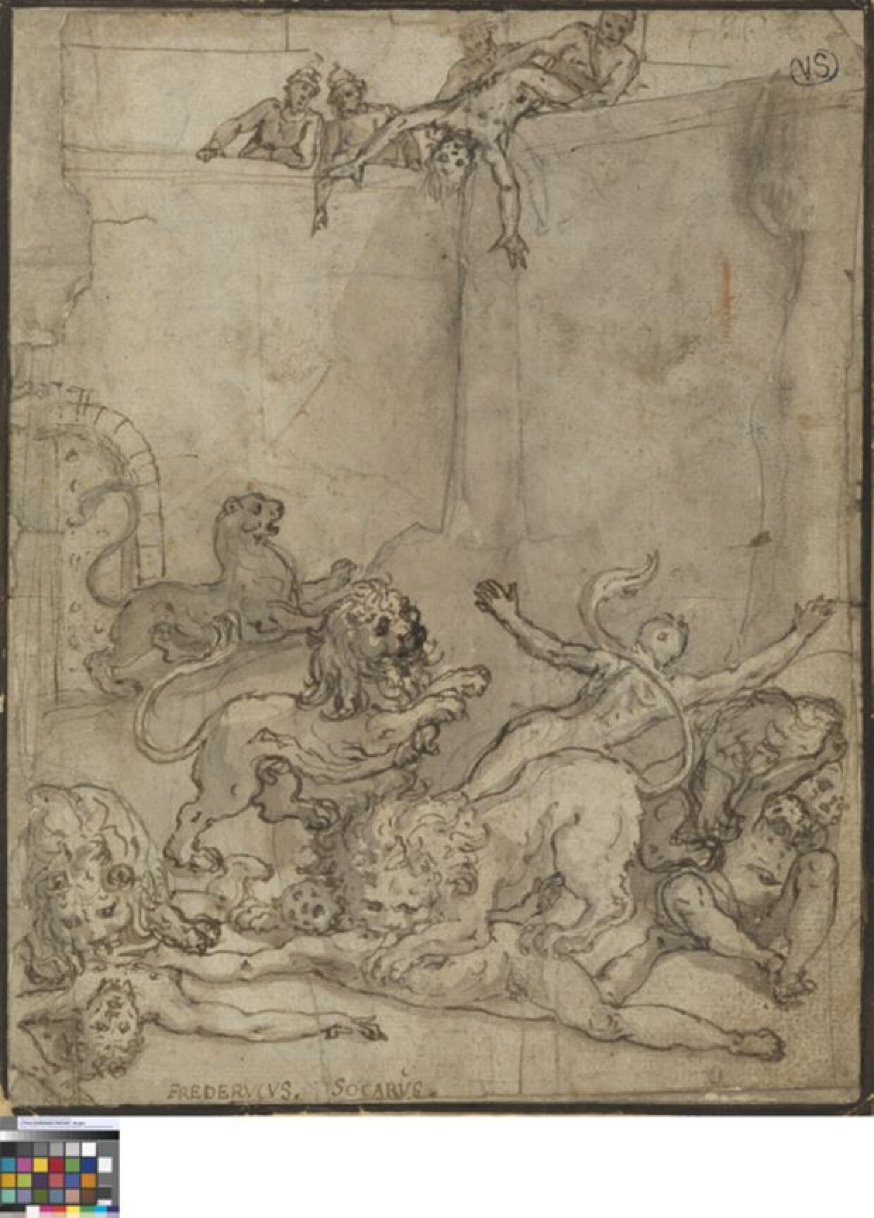16de eeuwDe tekening toont een oud-testamentisch verhaal uit het boek Daniël. Het verhaal vertelt over Daniël die in een leeuwenkuil wordt geworpen omdat hij God aanbad terwijl volgens de wet niemand anders dan koning Darius vereerd mag worden. Daniël wordt in de leeuwenkuil beschermd door een engel en de volgende dag wordt hij levend aangetroffen in de kuil. Koning Darius beveelt vervolgens Daniël uit de kuil te halen en de wetgevers die de wet - uit jaloezie om koning Darius' genegenheid voor Daniël - hadden opgesteld, in de kuil te gooien. Er bestaat ook een andere versie van het verhaal. Uiteindelijk worden de jaloerze wetgevers ook in deze versie in de kuil geworpen. Er zijn maar weinig kunstwerken waarin dit fragment uit het verhaal is afgebeeld, terwijl er veel werken bekend zijn waarop is afgebeeld hoe Daniël in de leeuwenkuil wordt geworpen. Wellicht werd te tekening gemaakt als voorbereiding voor de decoraties in de Anticamera degli Angeli in Palazzo Farnese in Caprarola, die tussen 1566-68 onder begeleiding van Federico Zuccari werden uitgevoerd, maar dit kan niet bevestigd worden. Onder leiding van andere kunstenaars werd daar een fresco van Daniël in de leeuwenkuil uitgevoerd met leeuwen die net als in de tekening ietwat lomp zijn, maar voor zover geweten heeft Federico het verhaal van Daniël naast de tekening in de collectie van Musea Brugge geen tweede keer afgebeeld.Wellicht is Federico geïnspireerd geweest door een prent met hetzelfde onderwerp van Philips Galle naar ontwerp van Maarten van Heemskerck. Voor de liggende figuur op de voorgrond greep Federico Zuccari mogelijk op een kopie naar een detail uit de Grimani Breviary en een schets naar het leven die in de Uffizi wordt bewaard.
