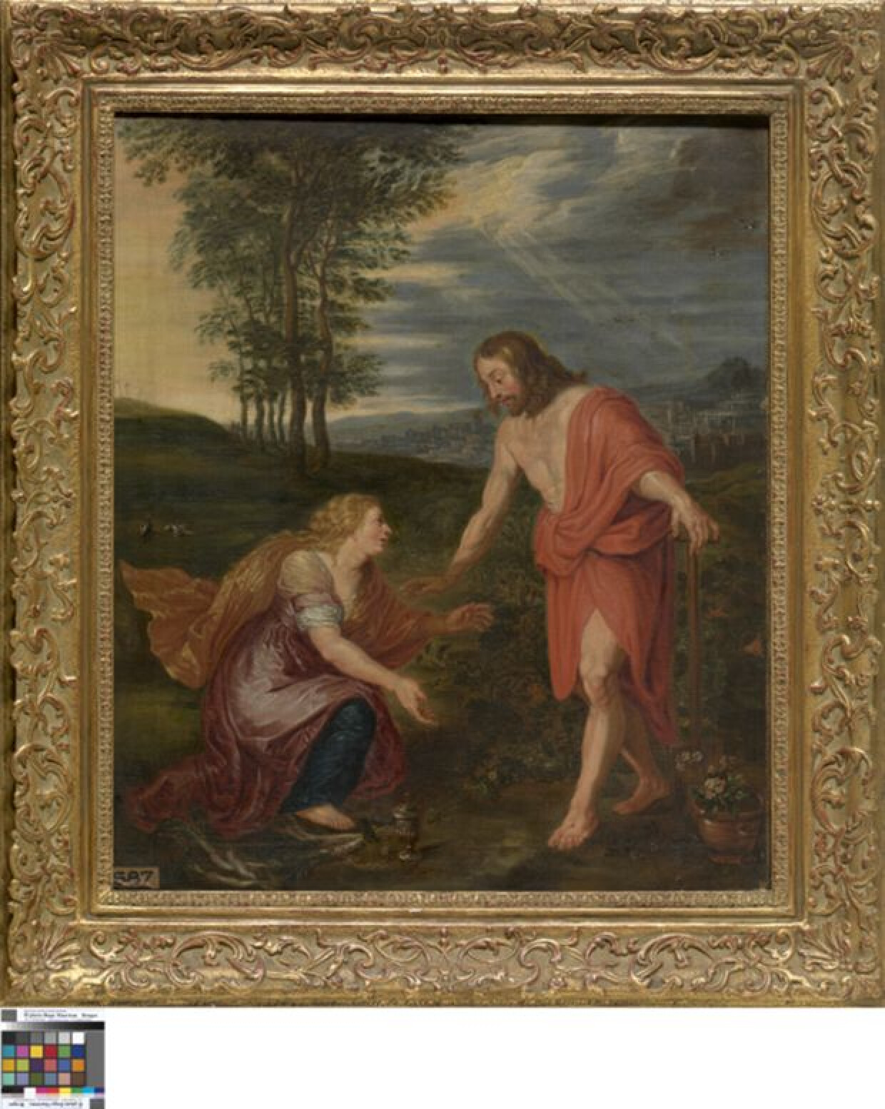 17de eeuwNa zijn verrijzenis verscheen Christus eerst aan Maria-Magdalena, die hem aanvankelijk niet herkende en aanzag als een tuinman. Jezus maakte zich vervolgens bekend, en zei haar hem niet aan te raken: 'Noli me tangere'. Hier is het moment weergegeven waarop Maria-Magdalena Christus herkent en voor hem knielt. Het is een kopie naar een in vele exemplaren bekende compositie van Rubens, rond 1615 door hem gemaakt in samenwerking met Jan Brueghel (I).