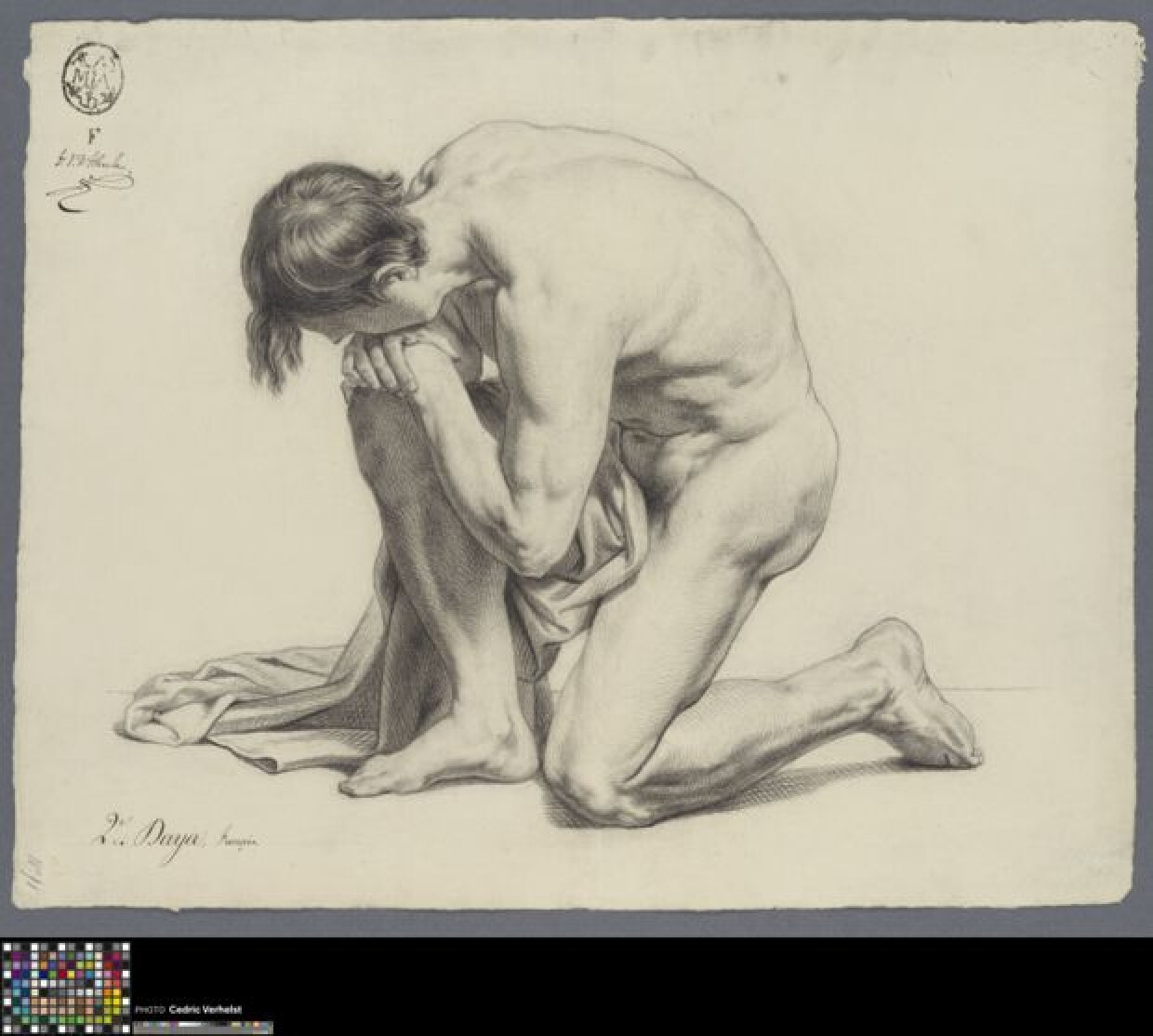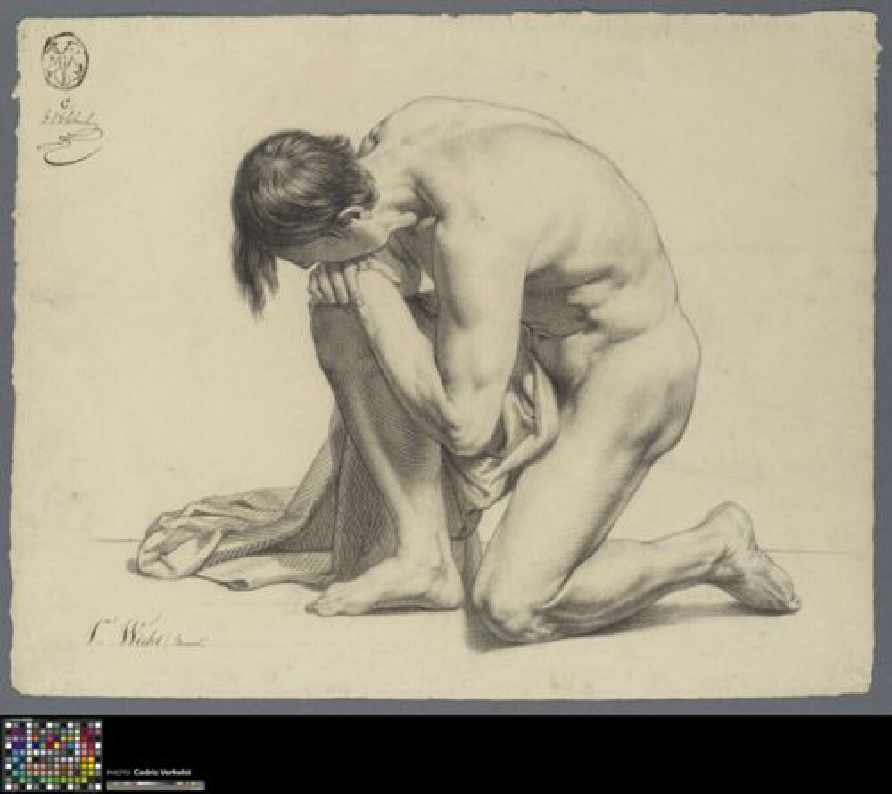 19de eeuwAcademische studie naar prent van een mannelijk naakt, getekend door François Dayer. Dayer tekende deze studie wellicht in de eerste klas naar prenten aan de Academie Brugge en werd er tweede mee op een wedstrijd. Een mannelijk naakt is voluit afgebeeld, knielend in profiel naar links. Zijn linkerknie raakt de grond terwijl hij naar voren gebogen, met beide handen op zijn rechterknie leunt. Hij verbergt zijn gezicht, rustend op de rug van zijn hand. Over zijn rechterbeen is een doek gedrapeerd dat verder op de grond ligt. Het gebruikte medium is zwart krijt of houtskool. Dayer tekende deze studie naar een prent van Julien uit de reeks 'Nouvelles Académies'. De aantekeningen duiden op zijn wedstrijddeelname. Linksboven staat zijn toegewezen letter 'F', bij de academiestempel met handtekening van secretaris Vanden Abeele. Dat Dayer tweede werd in de wedstrijd werd linksonder in rood krijt en met pen, en op verso genoteerd. Over welke wedstrijd het exact gaat, en wanneer deze plaatsvond is nog onduidelijk. Een datering kan wel geschat worden op basis van een archiefdocument en het watermerk in het papier (cf. FDM 1861). Zo wordt 'Francis D'haeyer' vermeld in de eerste klas naar prenten bij een wedstrijd om plaatsen in 1862, al klopt de ranking hier niet. Ook Bernard Wicht, die een tekening naar hetzelfde onderwerp maakte (0022.GRO0637.II), wordt in deze lijst vermeld. De aantekeningen op beide studies zijn bijna identiek. De tekeningen werden wellicht voor eenzelfde wedstrijd getekend, in diezelfde periode.