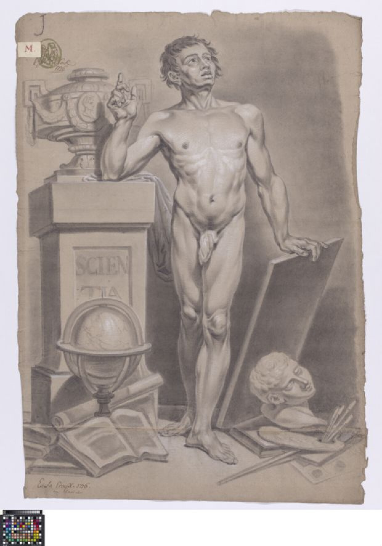 18de eeuwAcademische studie naar levend model van een staand mannelijk naakt, getekend door Emmanuel Lacroix in 1776. Lacroix tekende deze studie in het kader van de prijswedstrijd aan de Academie van Brugge in dat jaar. Hij was toen ingeschreven in de klas naar levend model en won de eerste prijs. Het model is afgebeeld als personificatie van de wetenschap. De staande naakte man is frontaal weergegeven. Hij kijkt omhoog en steunt met zijn rechter elleboog op een hoge sokkel met opschrift 'scientia', met daarop een vaas. Zijn andere hand leunt op een paneel of doek. Onderin liggen opeengestapelde boeken; verder is er een globus, een buste en een schilderspalet. Het gebruikte medium is zwart krijt of houtskool, gehoogd met wit krijt. Er is een aangelijmde strook onderin met verderzetting van de voorstelling en aantekening. Hierop werd de naam van de leerling genoteerd, met het jaartal van het concours. Linksboven is de tekenletter 'M' voor de anonieme jurering tijdens de prijskamp op de tekening verlijmd. Daar plaatste directeur Paul de Cock zijn handtekening en werd het verzamelmerk van de academie gestempeld. De behaalde prijs wordt met een 'J' (of '1') aangeduid. In datzelfde jaar werd Augustin van den Berghe tweede (0014.GRO0074.II). Verder tekenden Fricx en Riethage ook als liefhebbers (0014.GRO0089.II en 0016.GRO0050.II). Lacroix maakte voor dezelfde wedstrijd ook een studie naar een model, van op de rug gezien (0016.GRO0047.II).