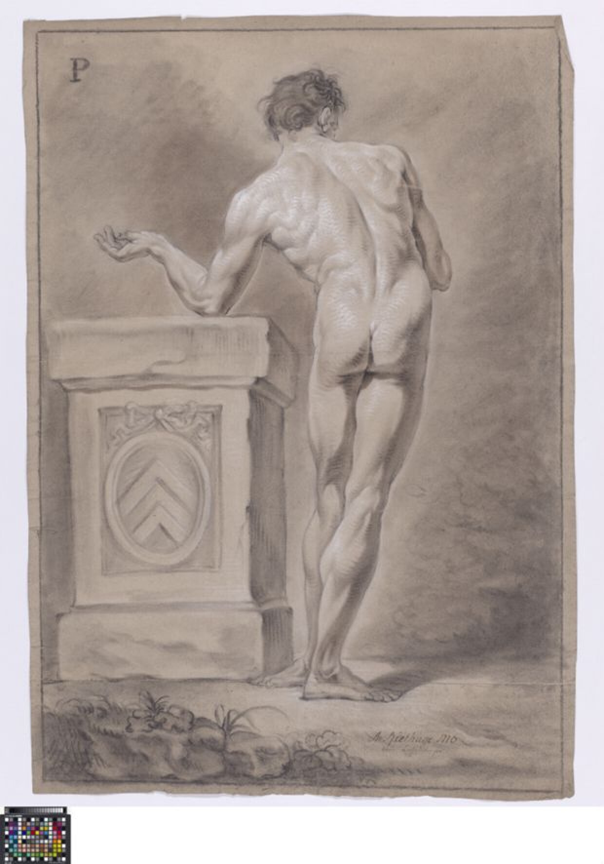 18de eeuwAcademische studie naar levend model van een staand mannelijk naakt, getekend door Albertus Riethage in 1776. Riethage tekende deze studie tijdens de prijswedstrijd aan de academie van Brugge in dat jaar. Als 'liefhebber' tekende hij niet om een prijs, want hij won de eerste prijs al tijdens de vorige wedstrijdeditie (1774). Het model is te zien van op de rug. Hij leunt met zijn linkerarm op een hoge sokkel met een wapenschild onder een guirlande. Het wapenschild komt overeen met dat van de familie de Schietere, waarop twee kepers afgebeeld zijn. Het lichaam van de man is licht gebogen. Zijn rechterarm houdt hij voor zich. De studie is gemaakt met houtskool of zwart krijt, gehoogd met wit krijt. De volledige compositie wordt omkaderd door een enkele lijn in zwart krijt. Onderaan het papier is een aangelijmde strook met aantekening: A. Riethage 1776, voor liefhebberije. Linksboven is de tekenletter van Riethage 'P' op de studie geschreven. In hetzelfde concours tekende Bernard Fricx ook uit liefhebberij (0014.GRO0090.II). Emmanuel Lacroix werd primus (0016.GRO0047.II), Augustin van den Berghe tweede (0014.GRO0091.II). Riethage tekende nog een tweede studie voor deze wedstrijd, waarop het model frontaal is afgebeeld (0016.GRO0050.II).