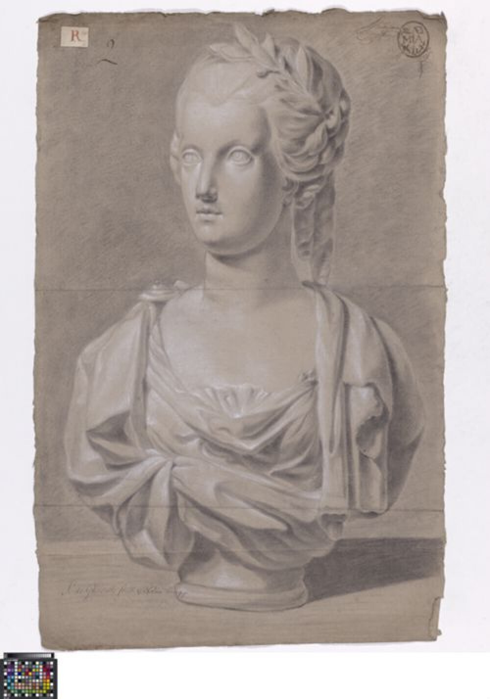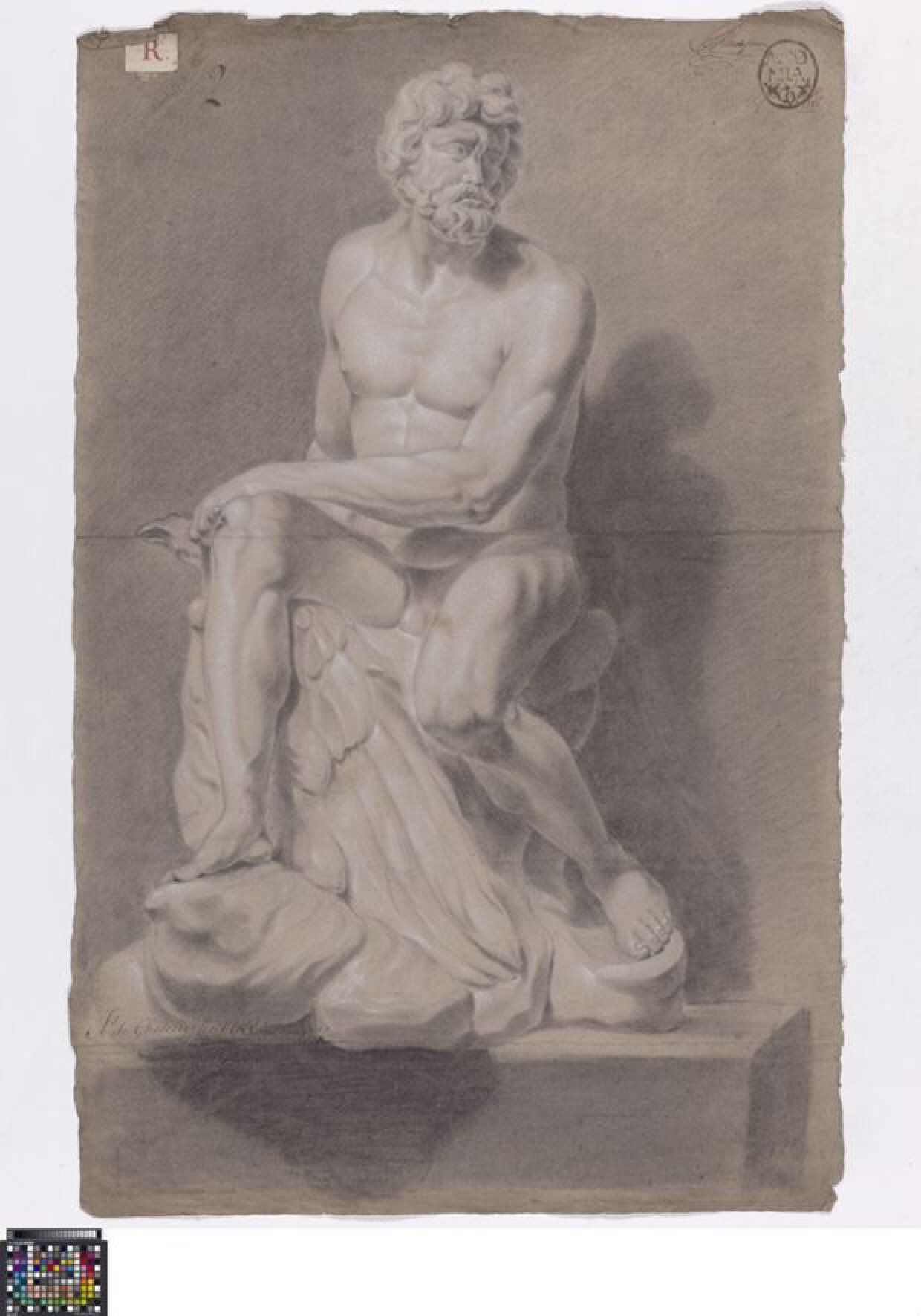 18de eeuwAcademische studie naar sculptuur van Zeus of Jupiter met adelaar, getekend door Bruggeling Joannes Gezelle voor het concours aan de Academie Brugge in 1788. Hij was toen ingeschreven als leerling in de klas 'naar het plaester' en maakte twee wedstrijdstudies (zie ook 0016.GRO0096.II). De studies zijn getekend in zwart krijt of houtskool, gehoogd met wit krijt. Gezelle won de tweede prijs tijdens het concours. Klasgenoot Ludovicus Gerbo werd toen primus (0016.GRO0094.II). Er werd getekend naar een sculptuur van Zeus als oppergod, met adelaar aan zijn voeten. Zeus wordt zittend op wolken afgebeeld. Hij kijkt opzij en legt een hand op zijn knie. De adelaar is een van de attributen van de god van hemel en bliksem. Het tekenpapier is samengevoegd met een strook onderaan, waarop de sokkel van de sculptuur getekend is. Boven deze papierstrook staat de aantekening: J[oanne]s de Gheselle fecit, 1788, van Brugge. De tekenletter 'R' bovenaan diende voor anonieme jurering. Rechtsboven is de academiestempel op het tekenpapier gedrukt, met de handtekeningen van directeur de Cock en secretaris Vande Steene in diezelfde hoek.