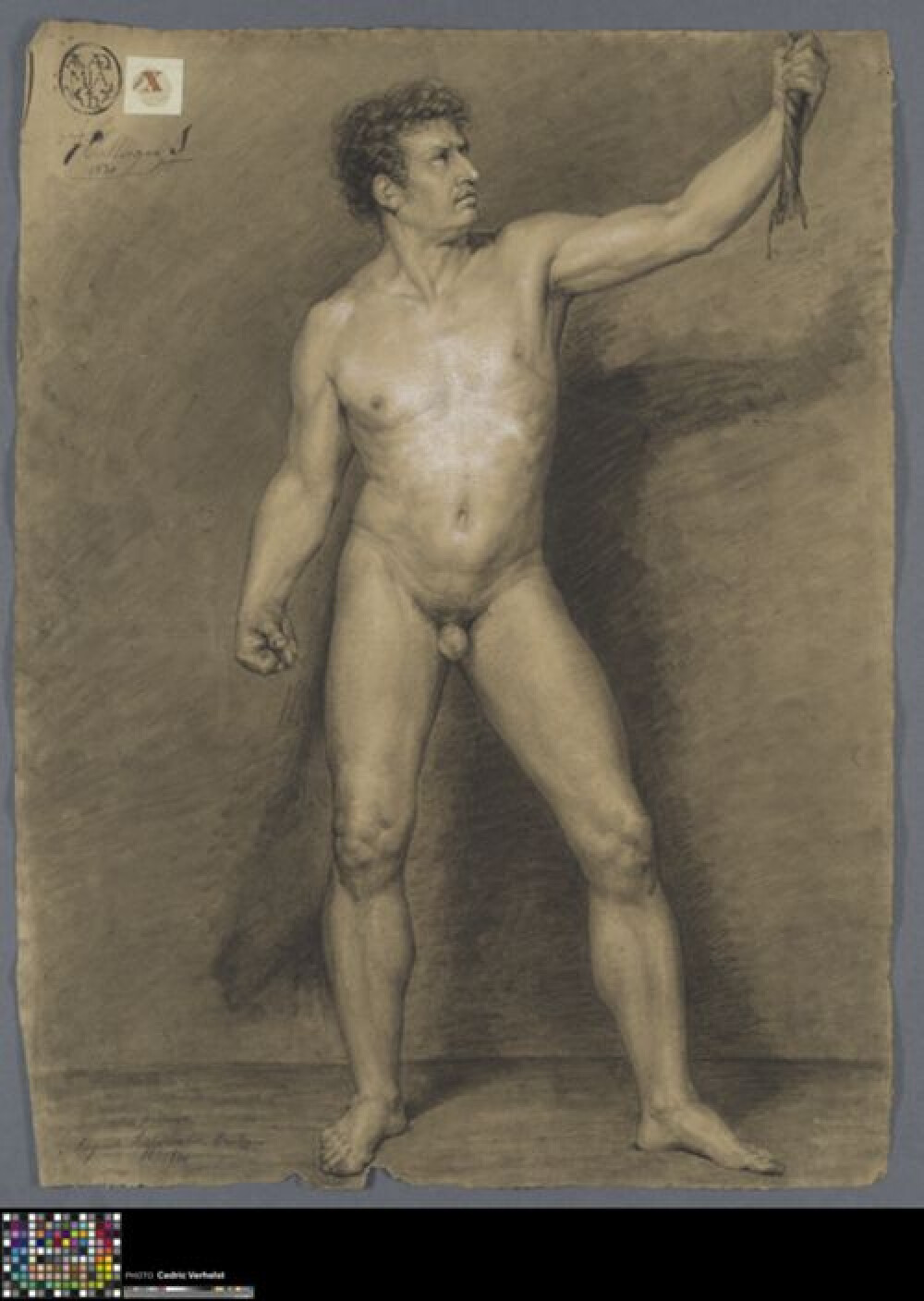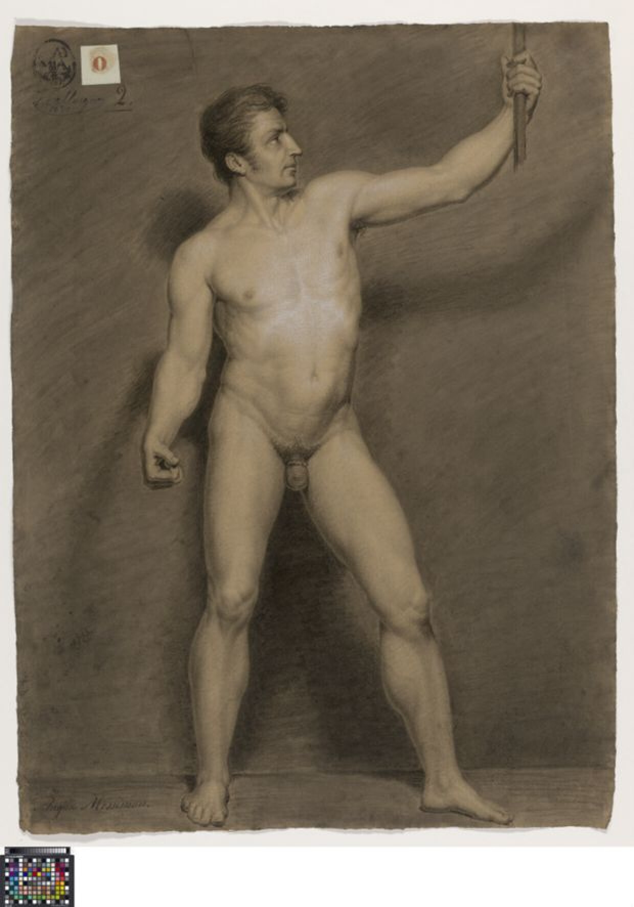 Academische studie van een mannelijk naakt, getekend naar levend model door Auguste De Mersseman in 1830. Toen hij deze studie maakte, was hij leerling in de klas naar model aan de Academie Brugge. Hij behaalde de tweede prijs van zijn klas tijdens de prijswedstrijd van 1830. Zijn klasgenoot Auguste Hoffman werd eerste (0022.GRO0388.II). Een naakte man is voluit en frontaal afgebeeld. Hij staat rechtop met gespreide benen en houdt zijn linkerarm omhoog. In zijn hand houdt hij een stok vast, waarvan enkel het uiteinde getekend is. Zijn gezicht is weergegeven in profiel naar rechts, de ogen gericht op zijn linkerhand. Hij laat zijn andere arm hangen naast het lichaam. Het gebruikte tekenmedium is zwart krijt of houtskool, met hoogsels in wit krijt. De aantekeningen op de studie verwijzen naar de wedstrijddeelname. Linksboven is de toegewezen letter 'O' op het tekenpapier bevestigd voor anonieme jurering. Daarnaast staat de academiestempel en de handtekening van directeur Jan-Robert Calloigne. Uit deze wedstrijd is ook een tweede studie van De Mersseman bewaard (0016.GRO0203.II). Voorafgaand aan de prijswedstrijd tekenden de leerlingen om beste plaatsen. De Mersseman behaalde daar de eerste plaats (0016.GRO0202.II).