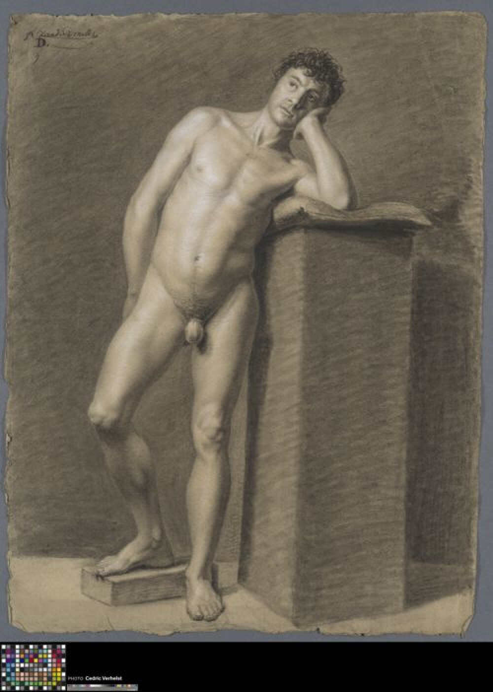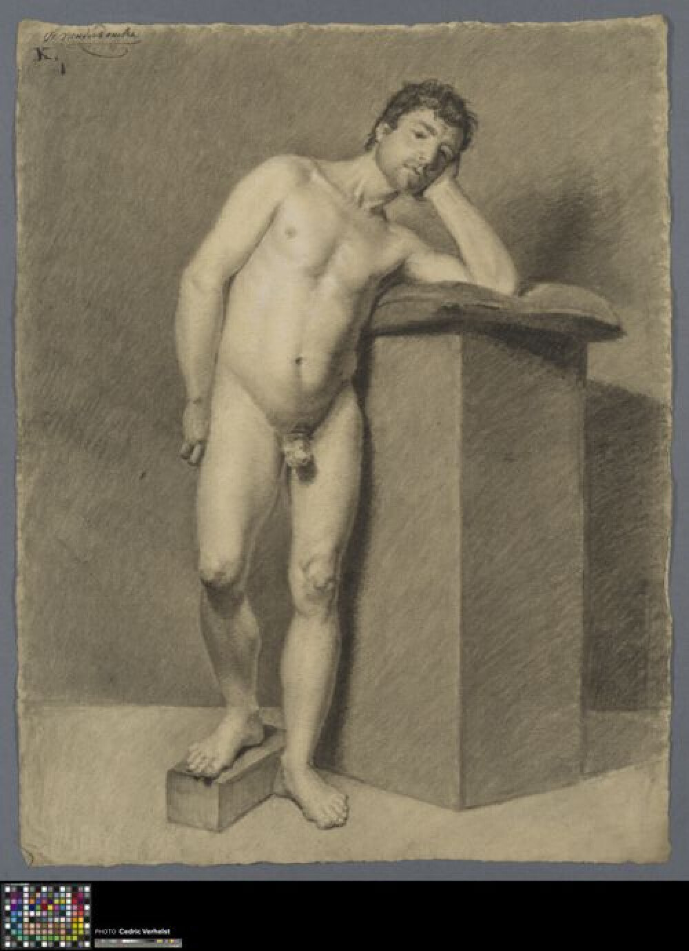 Academische studie naar levend model van een staand mannelijk naakt, getekend door een leerling aan de Academie Brugge. De naam van de tekenaar en de datum zijn onbekend. Het gaat om de wedstrijdstudie van de tekenaar die de tweede plaats behaalde in de klas naar het model. Deze leerling tekende anoniem onder de toegewezen letter 'I.' (linksboven). Daarnaast staat de handtekening van directeur van der Donckt, waardoor de vervaardigingsdatum van de tekening tussen 1802 en 1812 geschat kan worden. Het naaktmodel is frontaal getekend. De man staat naast een hoge sokkel, waarop hij met zijn linkerelleboog leunt. Hij steunt op een blokje met zijn rechtervoet. Het gebruikte medium is zwart krijt of houtskool met hoogsels in wit krijt. Ook de studies van de leerlingen die eerste en derde werden, bleven bewaard: 0022.GRO0511.II en 0022.GRO0361.II. Ook deze studies zijn anoniem en ongedateerd.