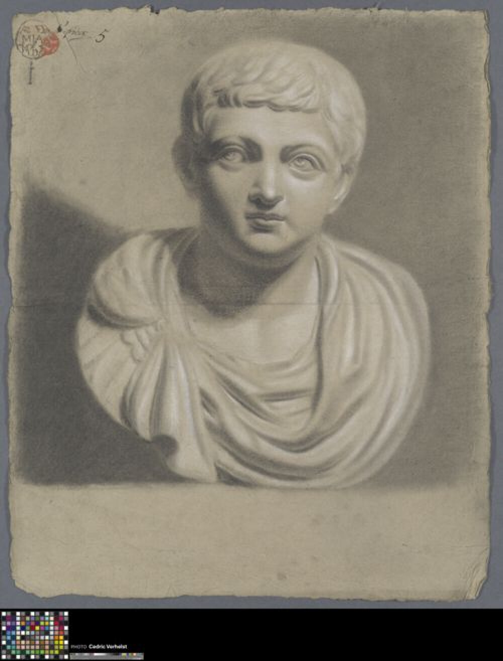 Academische studie naar sculptuur van een buste van een Romeinse jongen, getekend in zwart krijt of houtskool en gehoogd met wit krijt. De naam van de leerling en de datum zijn niet vermeld. Vermoedelijk werd deze tekening gemaakt in een wedstrijd om beste (zit)plaatsen in 1797. De anonieme leerling behaalde de zevende plaats. François van Nieuwenhuyse werd toen eerste: 0016.GRO0011.II. De letter Q in de linker bovenhoek verwijst naar de anonieme jurering. Er werd getekend naar een buste van een Romeinse jongen met een gewaad rond de schouders geknoopt. Linksboven staat de academiestempel met de handtekening van leraar Fricx. Drie andere studies uit deze wedstrijd zijn bewaard, getekend door anonieme leerlingen.