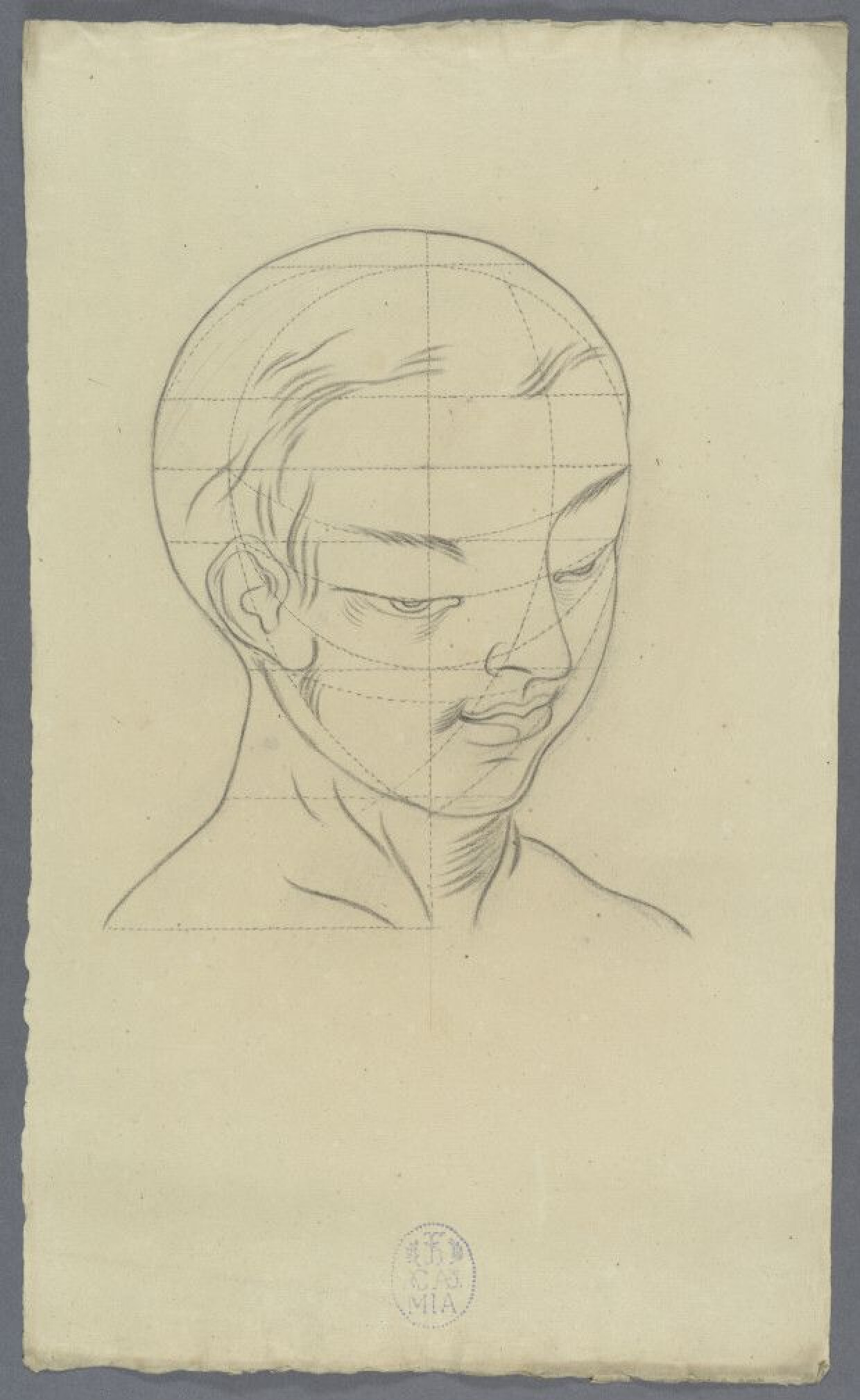 19de eeuw 18de eeuwAcademische studie naar prent van het hoofd van een figuur. De figuur is driekwart naar rechts weergegeven tot aan de hals. De studie focust op de verhoudingen met aanduiding van hulplijnen. Het gebruikte medium is zwart krijt of houtskool. Het tekenpapier is bijgesneden tot een kleiner formaat met behoud van drie originele schepranden. Wellicht werd deze studie gemaakt in de klas naar prenten aan de Academie van Brugge. Er werd vermoedelijk getekend naar een prent uit de reeks 'Troisième Cahier de Principes de Dessin par différents Maitres' van Bonnet (graveur), zie 0022.GRO1187.II. De naam van de tekenaar en de datum zijn onbekend.