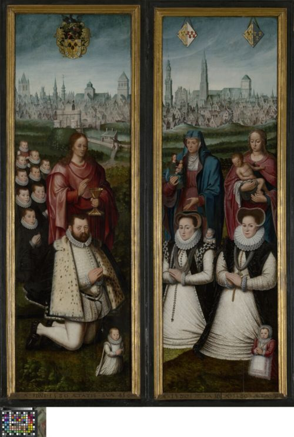 16de eeuwVoorstelling van Juan II Pardo met zijn patroonheilige Johannes en zijn tien zonen. Op de achtergrond een stadsgezicht van Brugge, met o.a. de torens van Sint-Gillis, Poortersloge, Oosterlingenhuis, Huis de Zeven Torens, Sint-Donaas en Sint-Jacob. Op de achterzijde van het paneel het wapenschild van de geportretteerde op een (toegevoegde) roodbruine achtergrond.